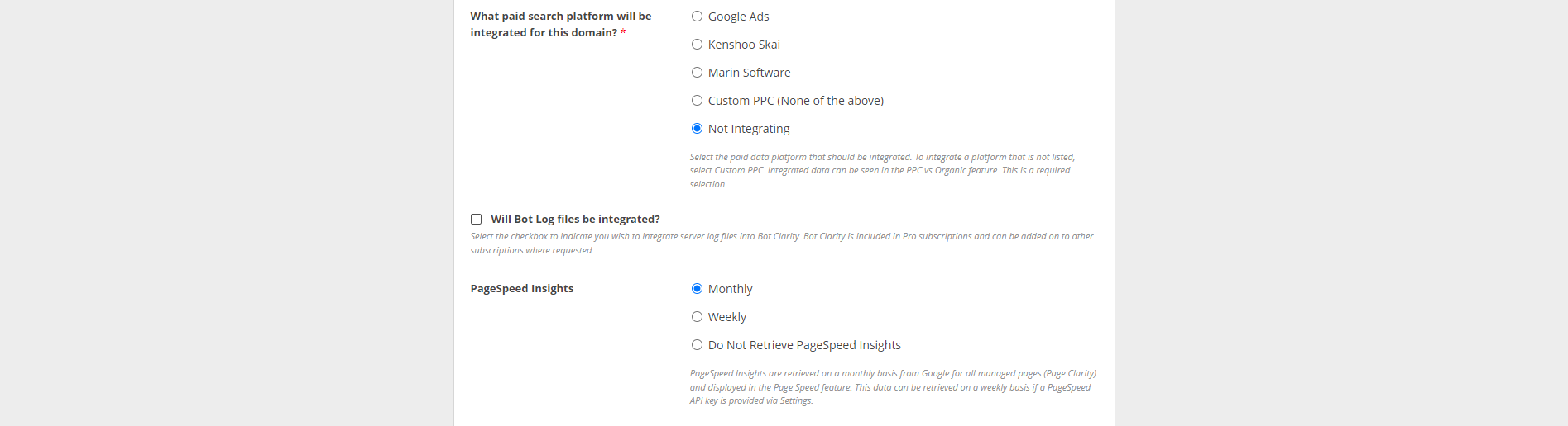 Bot Log Files Integration: Select the checkbox to indicate you wish to integrate server log files into Bot Clarity. Bot Clarity is included in Pro Subscriptions and can be added on to other subscriptions where requested.