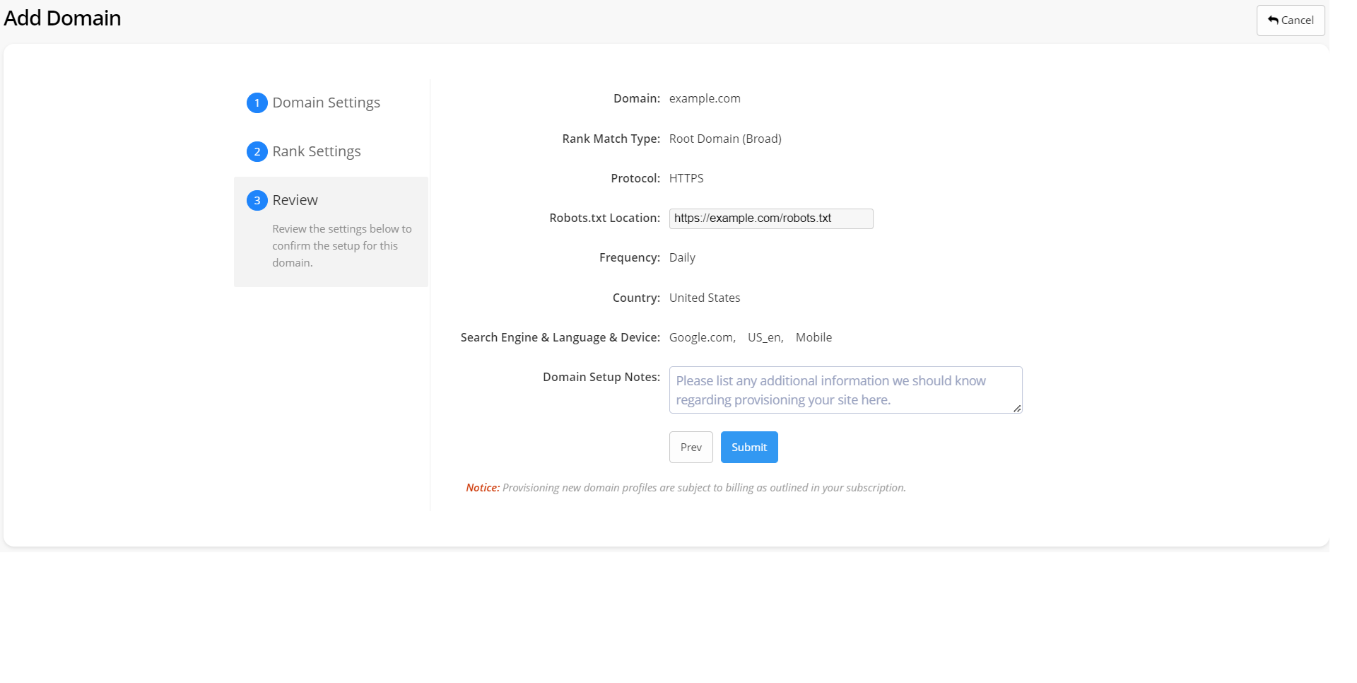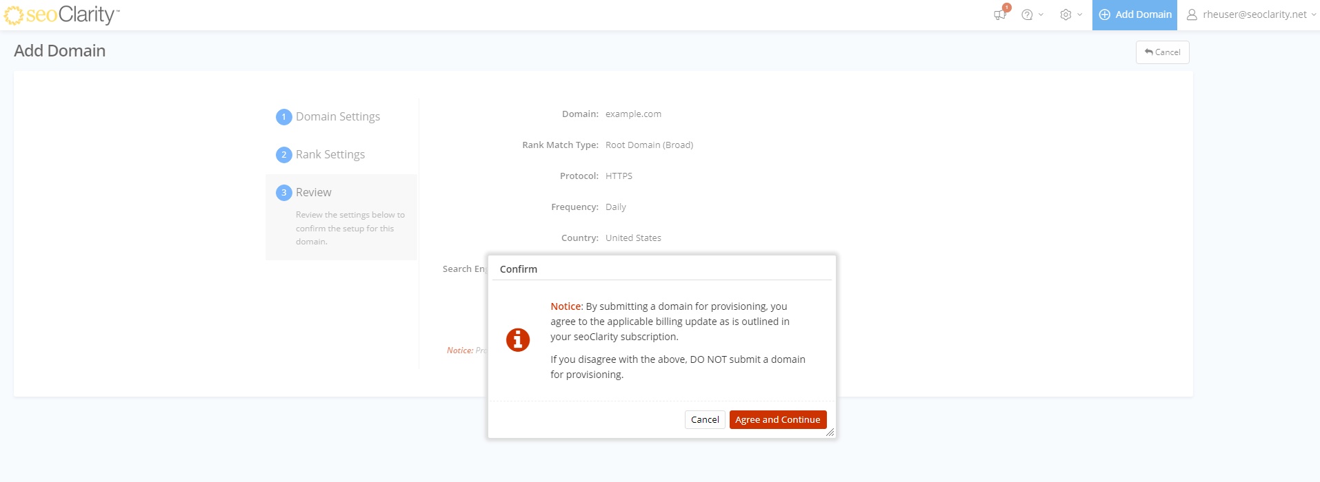 By submitting a domain for provisioning, you agree to the applicable billing update as is outlined in your seoClarity subscription.