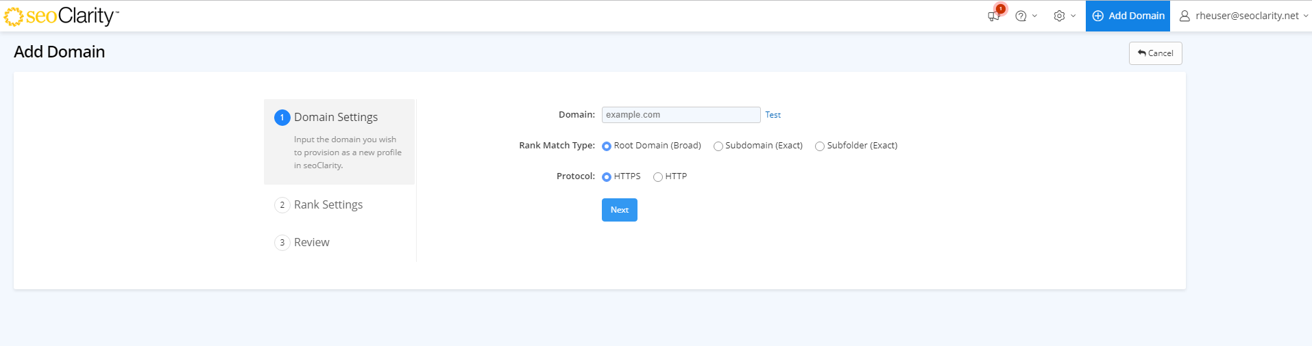 Domain: Input the specific domain to be provisioned as a profile in seoClarity. Use the Test link to validate the domain.
