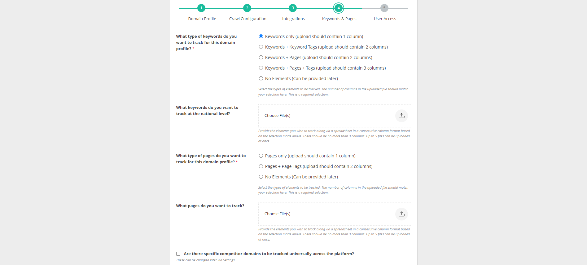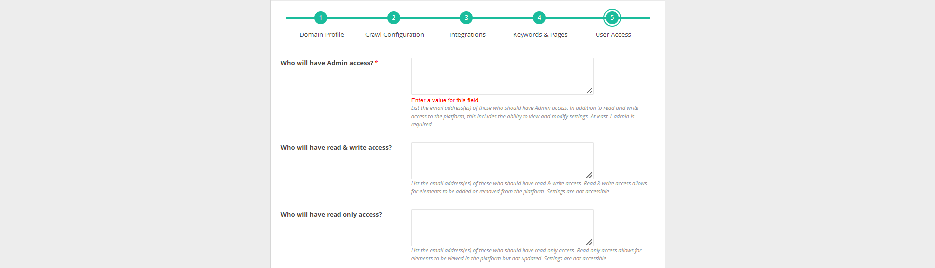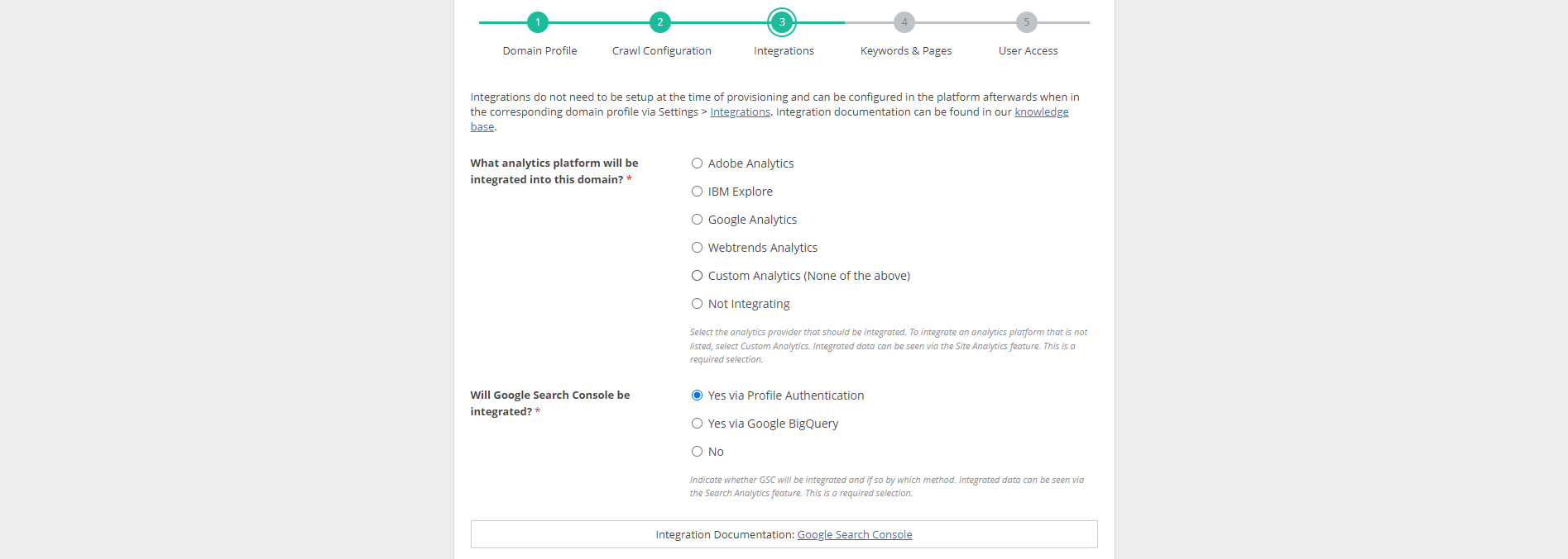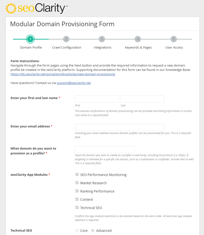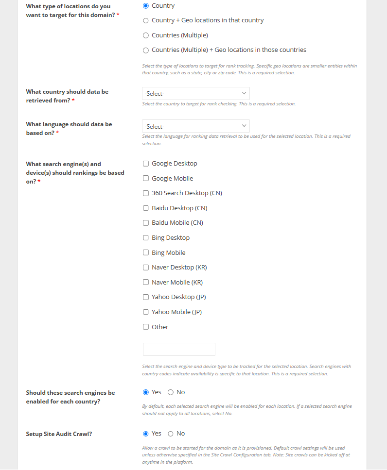 Fill in as much information as possible & we can assist in setting up your domain profile(s). The bare minimum needed to activate a domain are: Domain name (with protocol), Country and language of focus, 1 Search Engine and 1 User email. Additional items seen in the provisioning form are used for configuration. Activation and configuration are the initial pieces of the onboarding process.