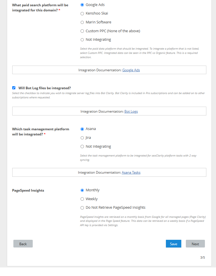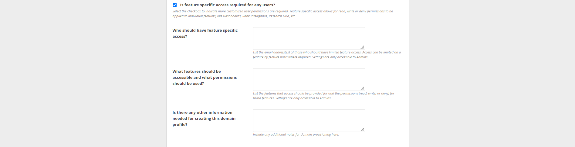 What domain do you want to provision as a profile?*: Input the domain you wish to create as a profile in seoClarity, including the protocol (i.e. https). If targeting is intended for a specific site section, such as a subdomain or subfolder, include that as well. This is a required field. Additional domains can be provisioned by filling out the form for each domain.