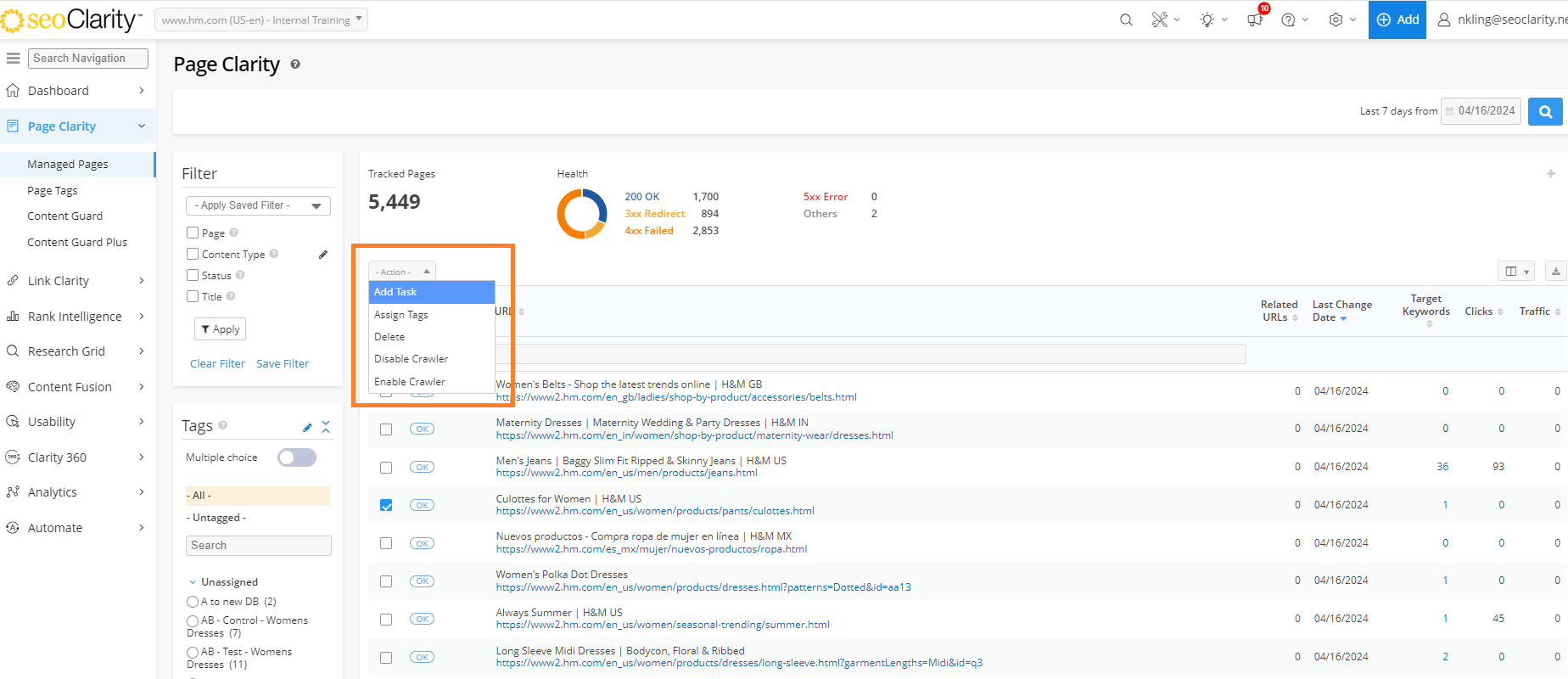 This overview provides an easy understanding of the Page Clarity tool. It was designed to enable you to monitor and manage your Target URLs at any level you choose. This guide will walk you through the process of adding URLs, adding URL tags, RSS sources and how to set up Dynamic Rules to add newly added URLs to tags automatically.