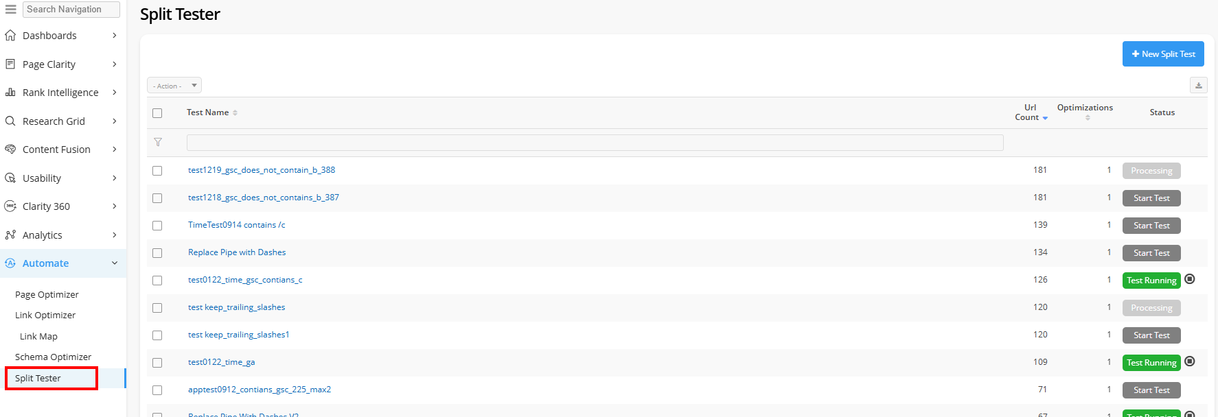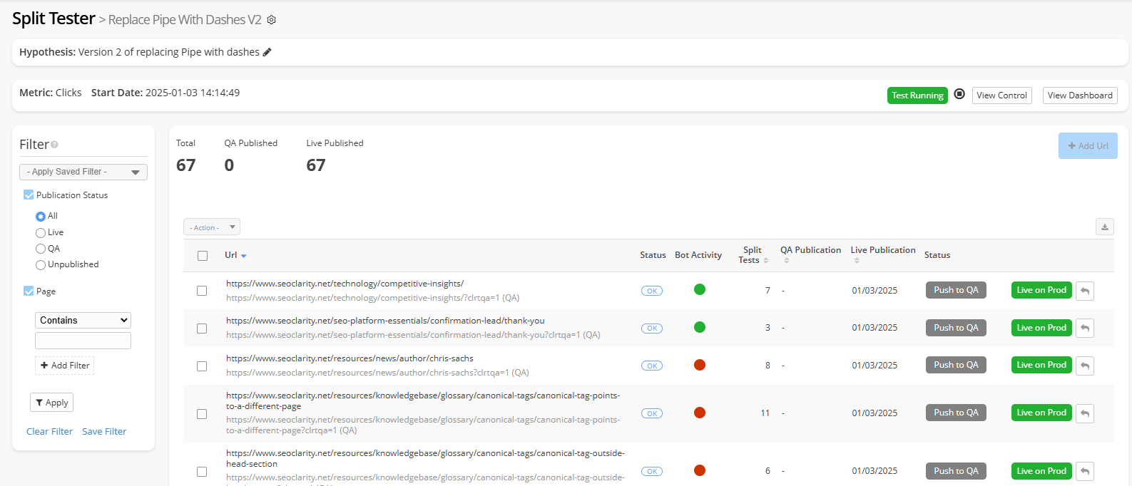 - Create Test/Control: The selected URLs will be split into correlated test and control groups and tagged in the platform accordingly. The optimizations specified will be applied to the test group URLs only.