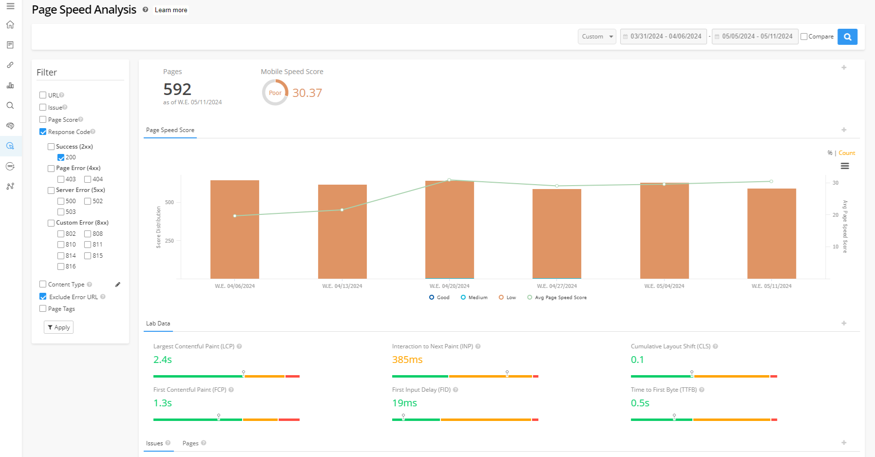 Page Speed is a metric that comes from Google's Page Speed Tool based on Lighthouse lab data and is based on a scoring of 0-100, where 100 is the fastest and 0 is the slowest. Page Speed Data retrieval occurs throughout the period specified (monthly or weekly), which means queries to Google's Pagespeed Insights tool start at the beginning of the period and run throughout the period until data is available for all managed pages. Learn More
