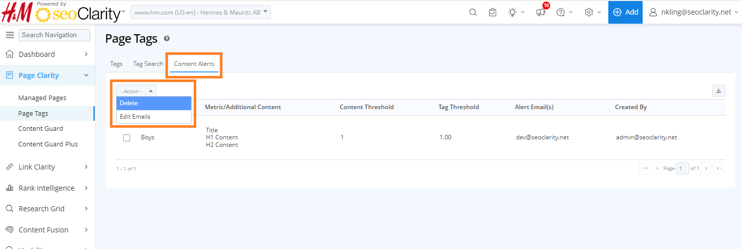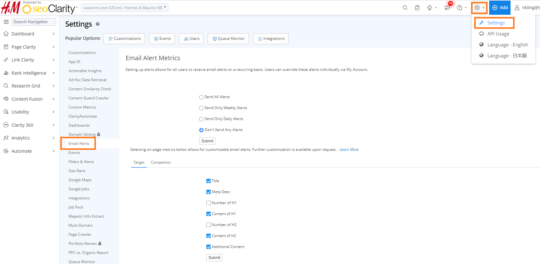 Default recurring (daily, weekly, monthly) email alerts can be enabled for all users with access to a domain based via the Email Alert Setting. Additional on-page metrics for your domain or competitors can be added to Content Change Alerts. Pages need to be managed in a tag for Content Change Alerts to be setup.