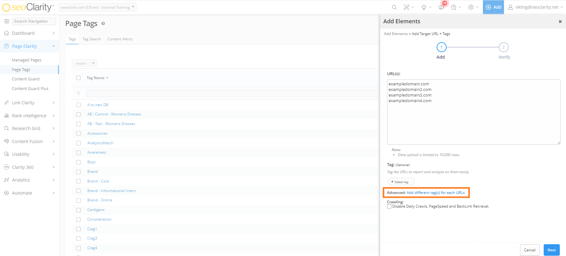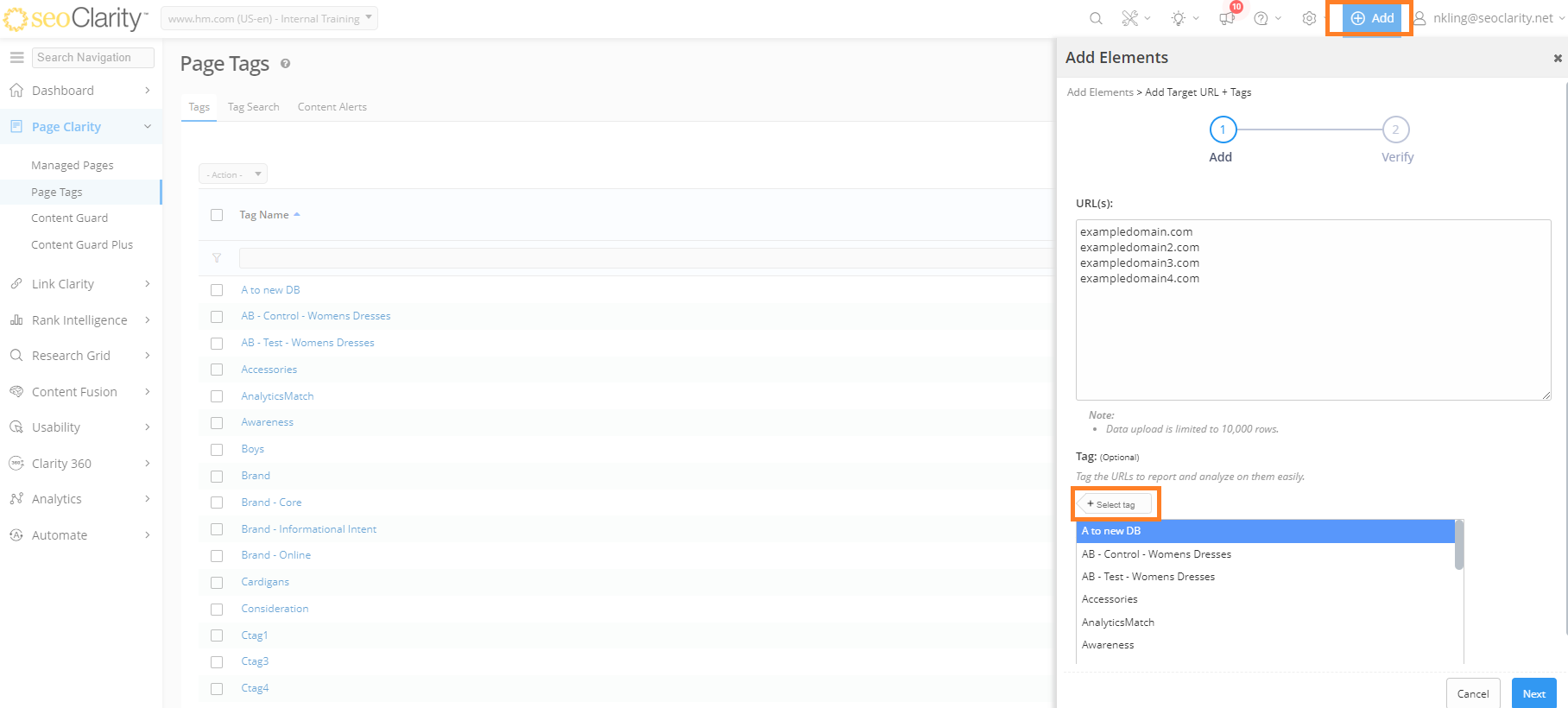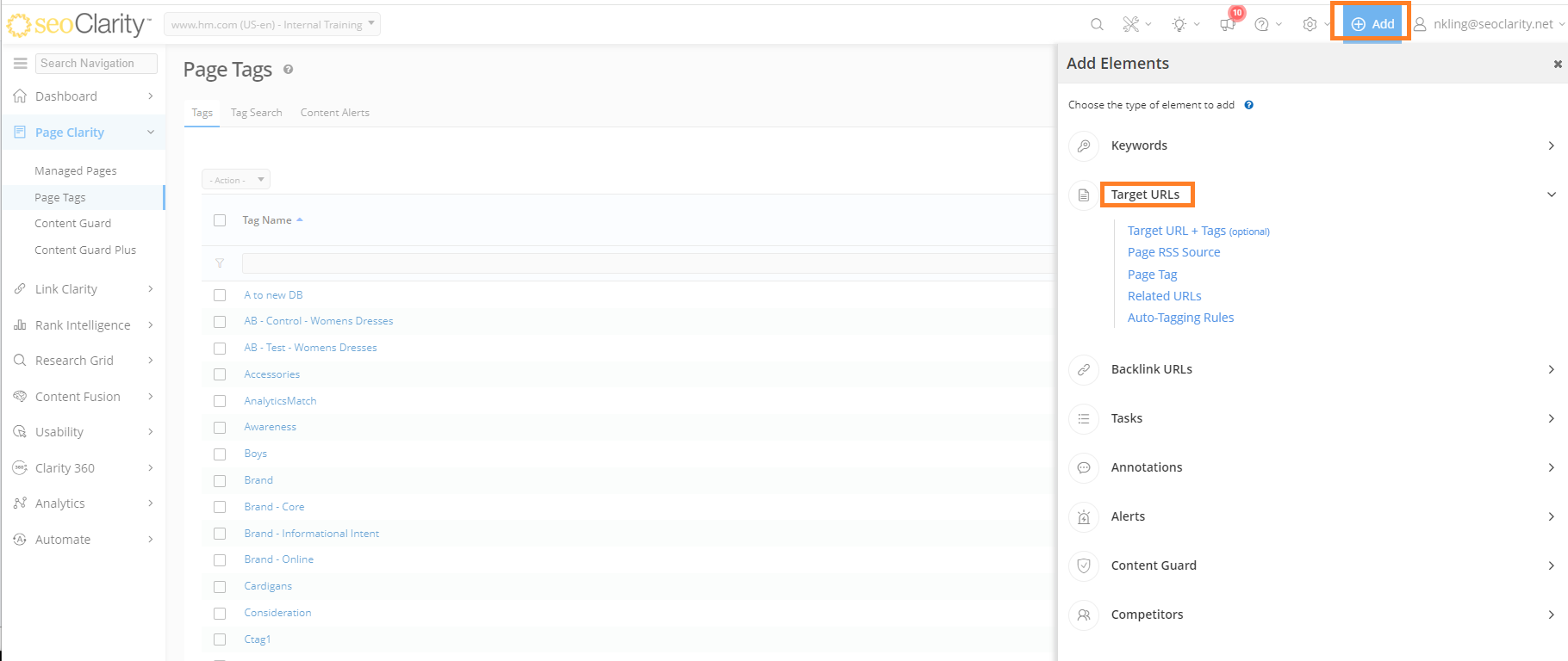 To start this walkthrough, you will need to be in the Page Tags section of the seoClarity platform. Click here to go to the feature or click on Page Tags located in the Page Clarity section of the navigation.