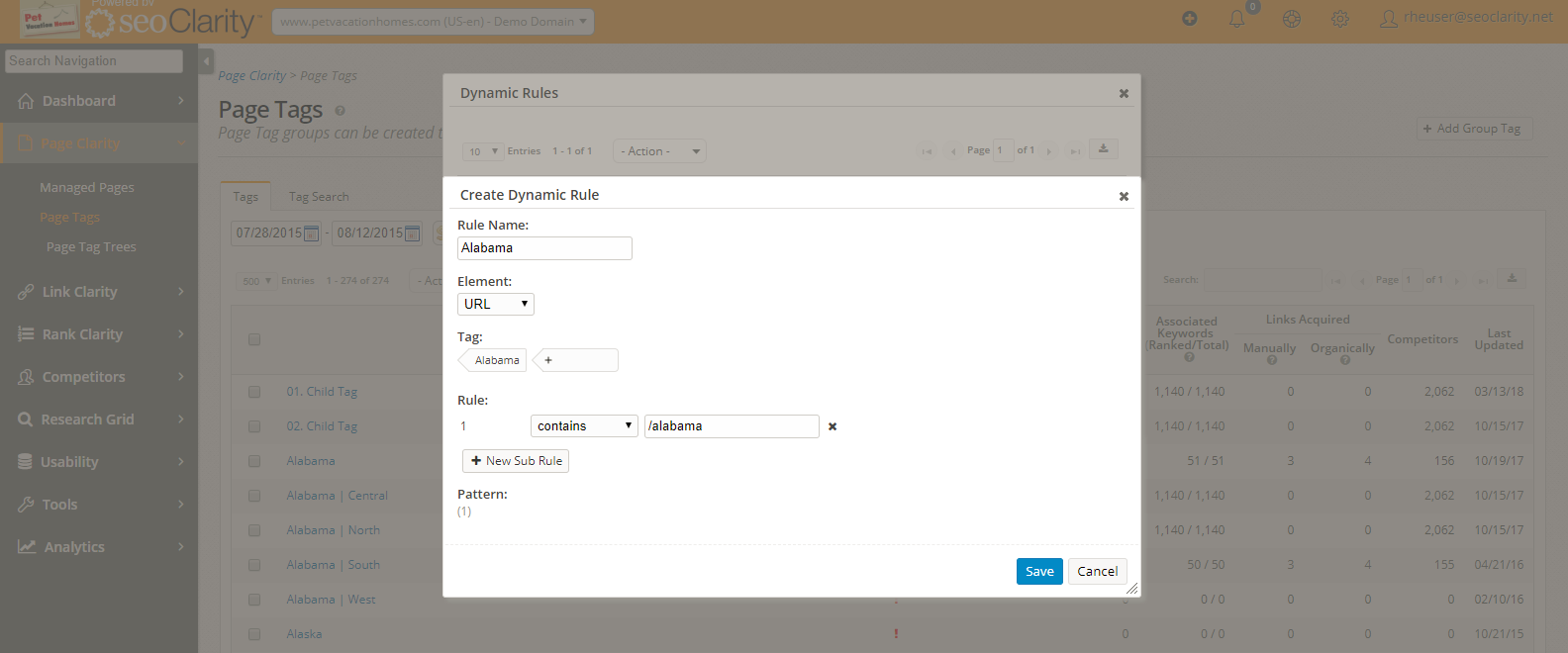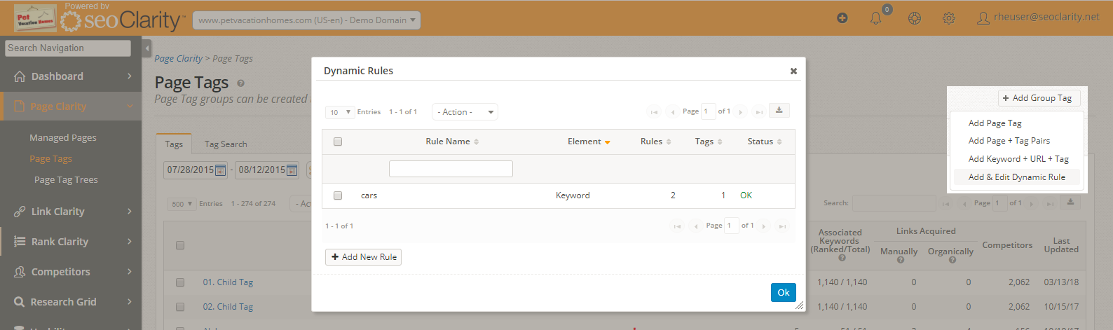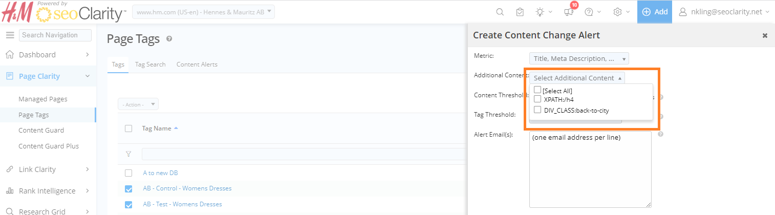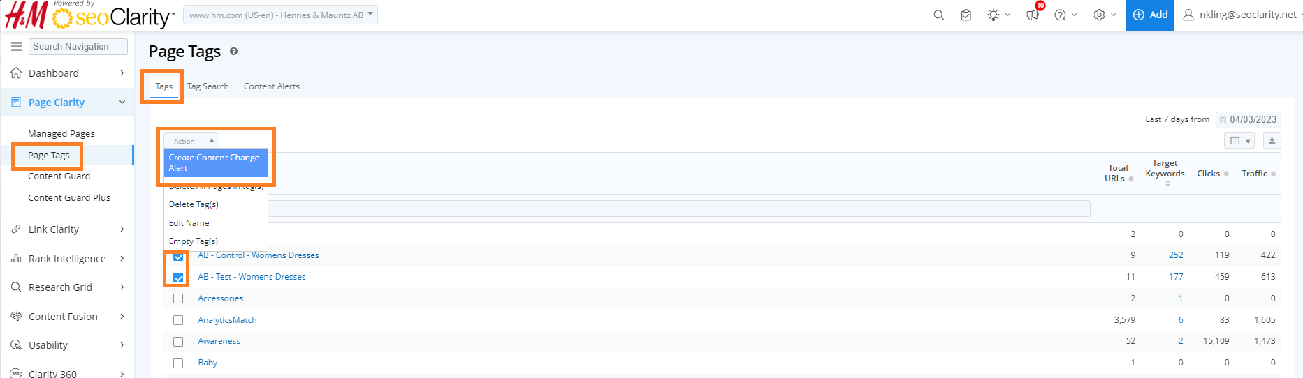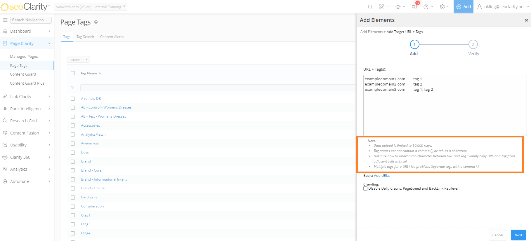 To start this walkthrough, you will need to be in the Page Tags section of the seoClarity platform. Click here to go to the feature or click on Page Tags located in the Page Clarity section of the navigation.