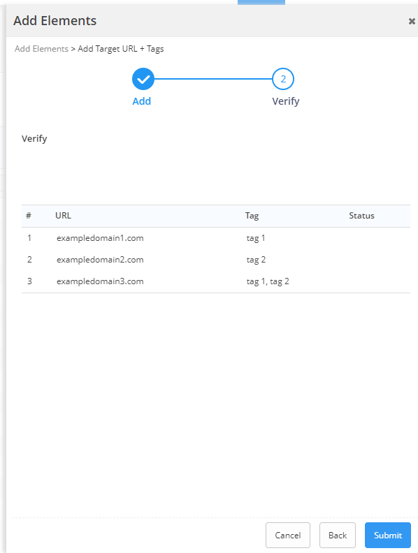 If the preview looks correct, click Submit. If not, select Back and review the input. A popup message will appear confirming the elements have been successfully added to the queue. Click Ok to confirm.
