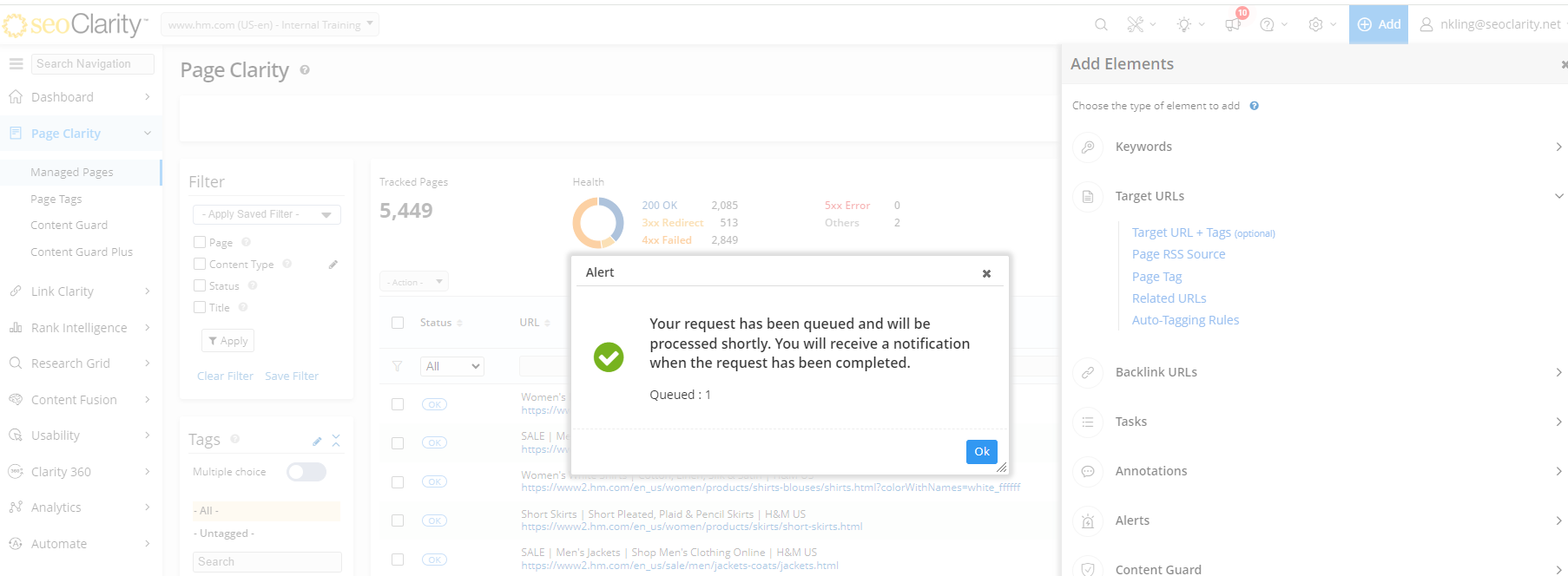 5. A popup message will appear confirming the elements have been successfully added to the queue. Click Ok to confirm