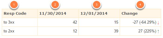 - 2nd Date Column: Displays the number of changes for each Response Code on that specific date for comparison to the previous date. For the second date there are 148 pages that changed to a 3xx response code which is a decrease from the previous day.