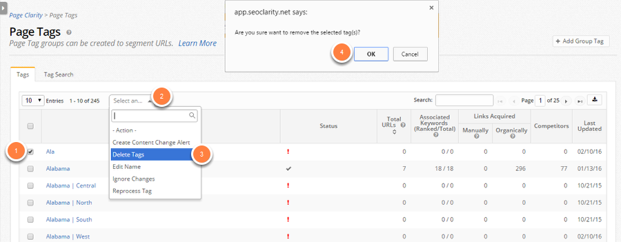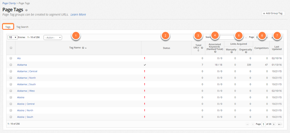 - URLs in Tag: Displays the number of managed pages for that Page Tag.