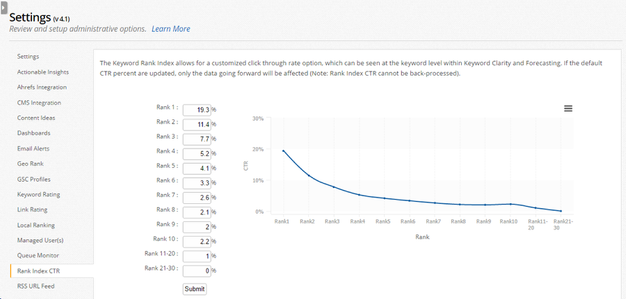 The Rank Index CTR Setting allows for a customized click-through rate option, which can be seen at the keyword level within Click-through Rate feature, the Traffic Potential feature, and the Forecast feature. These customizations are very important based on your company's industry.