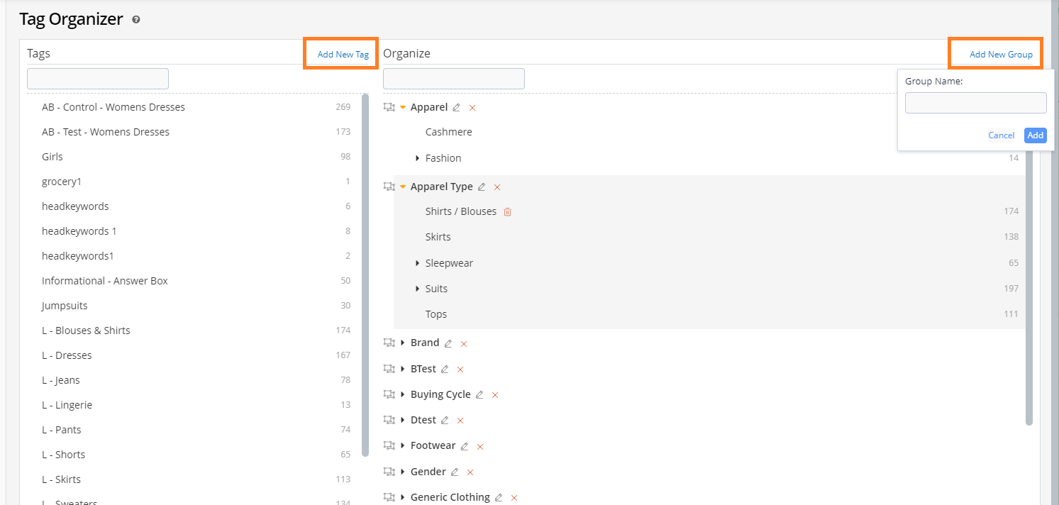 Clicking on the edit button will open the Tag Organizer. In the Tag Organizer you can:
