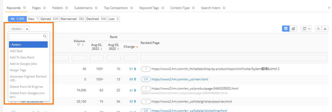 - Associate Highest Rank URL: Allows the selected keywords to be associated to their highest ranking URL.