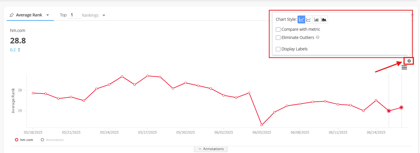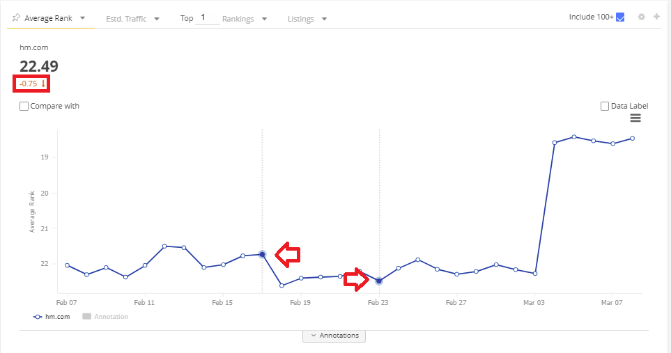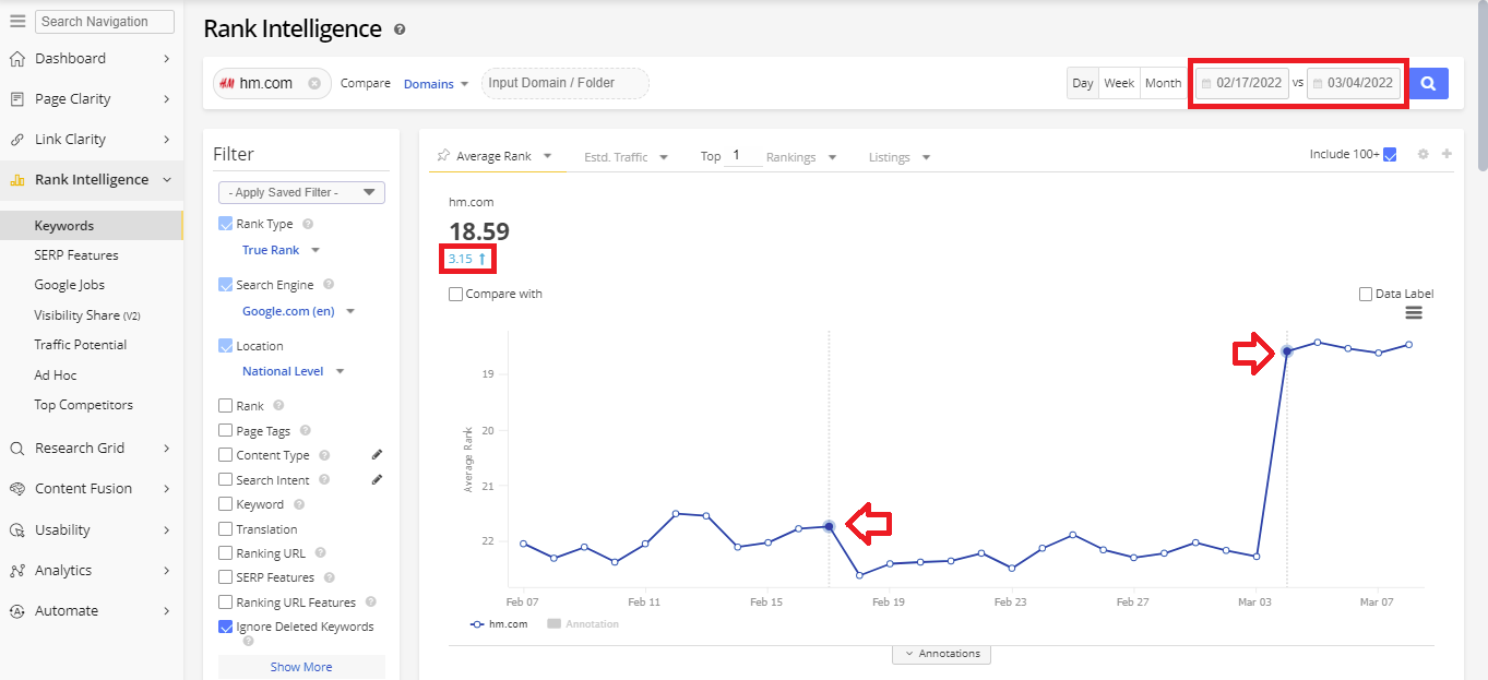 When specifying a date range or selecting two points within the graph, you'll either see a blue arrow pointing up or a red arrow pointing down located under the average rank. This identifies either the amount of increase or drop in rank between the two end dates selected.