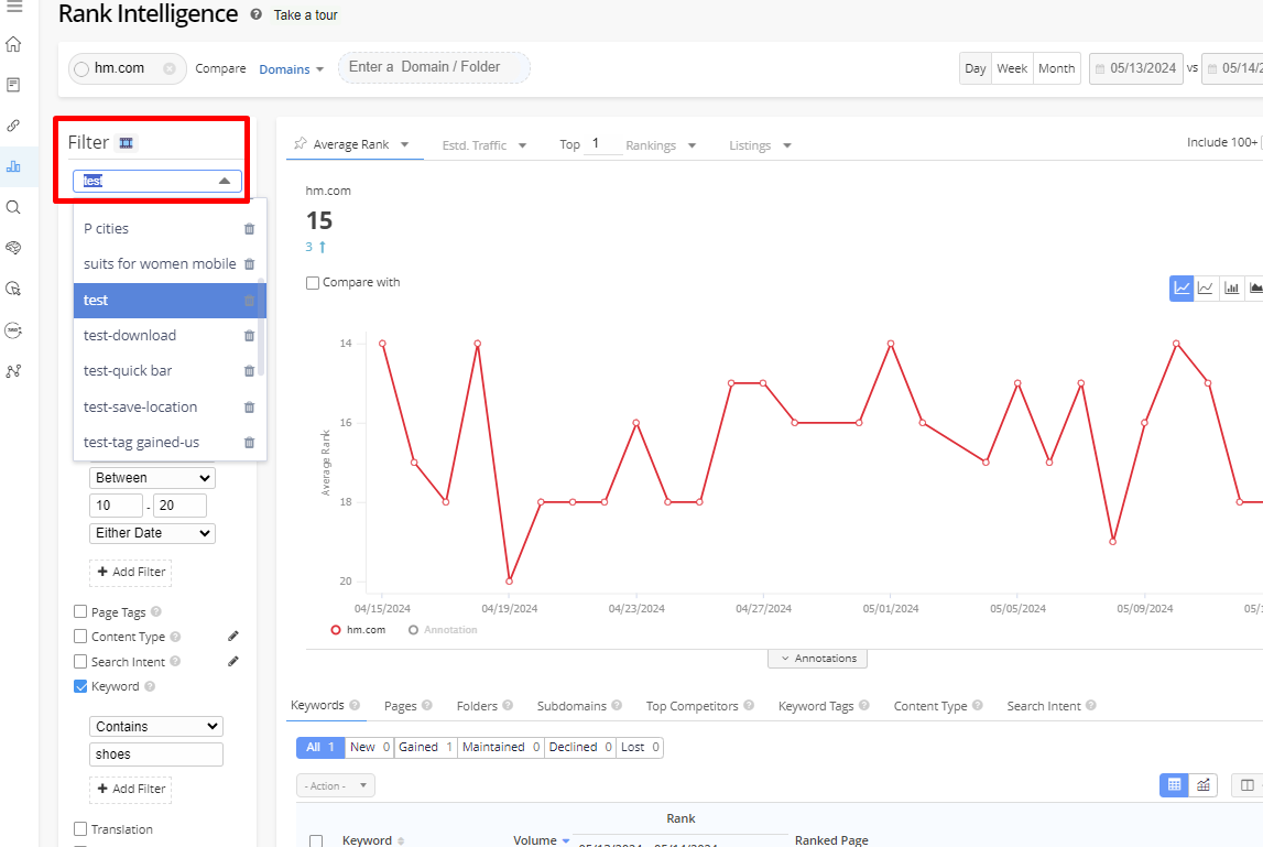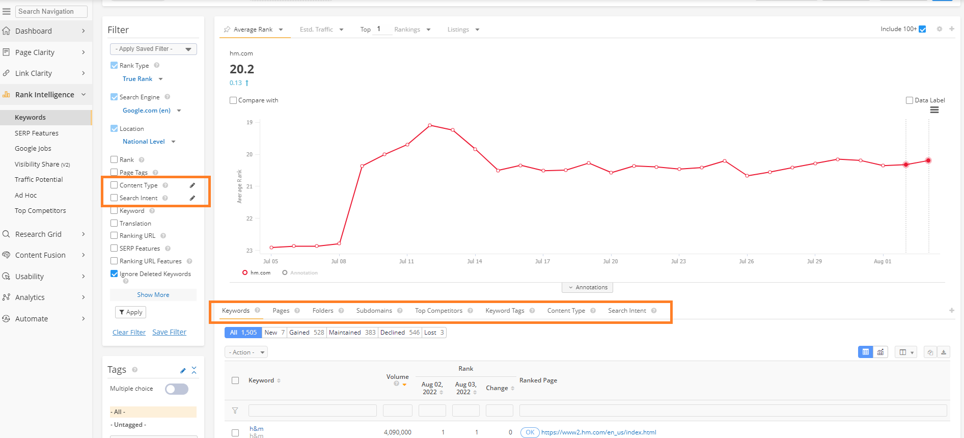 Search Intent: Displays ranking performance by Search Intent based on created Search Intent in the filter menu (keyword filter).