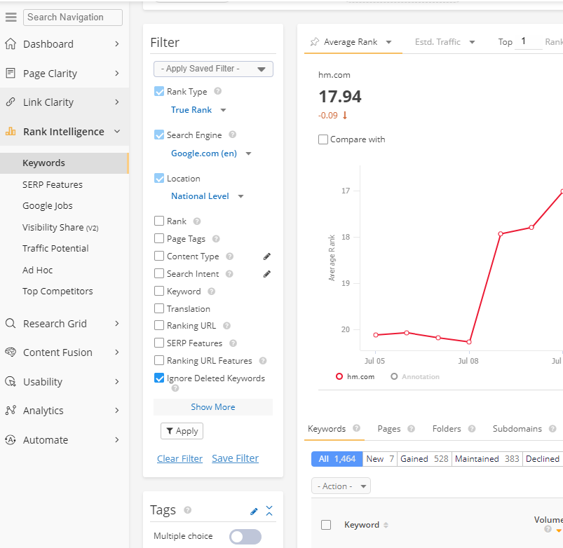 This article focuses on the Keyword Rankings section of Rank Intelligence. Rank Intelligence allows for on-the-fly analysis of your managed keyword set for multiple ranking metrics compared to multiple domains. Historical data can be viewed for new tags without the need to reprocess and tags can be further grouped by type.