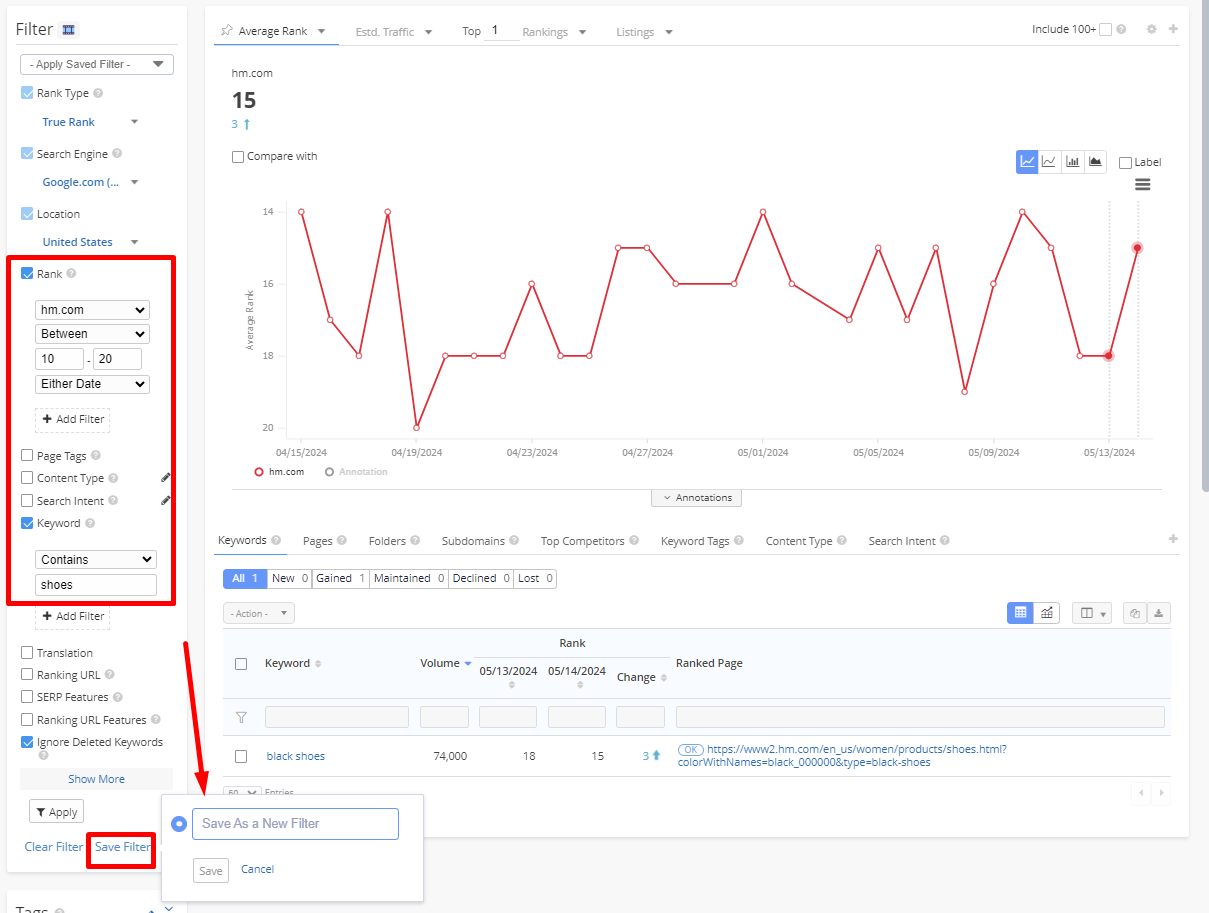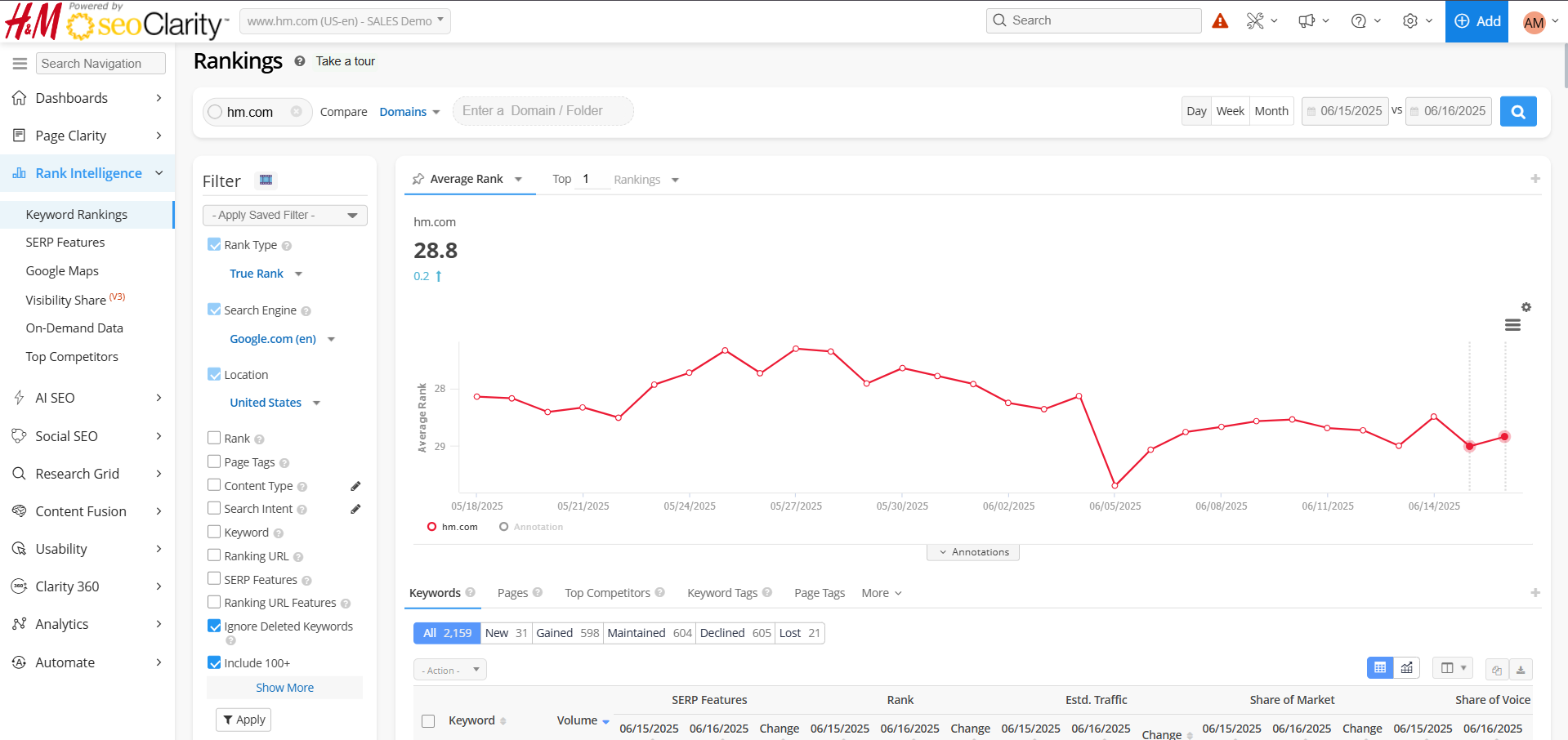 View, sort, filter, and analyze your ranking data dynamically to focus on specific metrics or segments for real-time insights