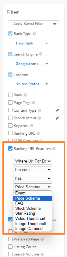 Ranking URL Features: Select this option to filter data for URLs that have or do not have Event, Price Schema, FAQ, Stock Schema, Star Ratings, Video Thumbnail, Image Thumbnail, or Image Carousel features.