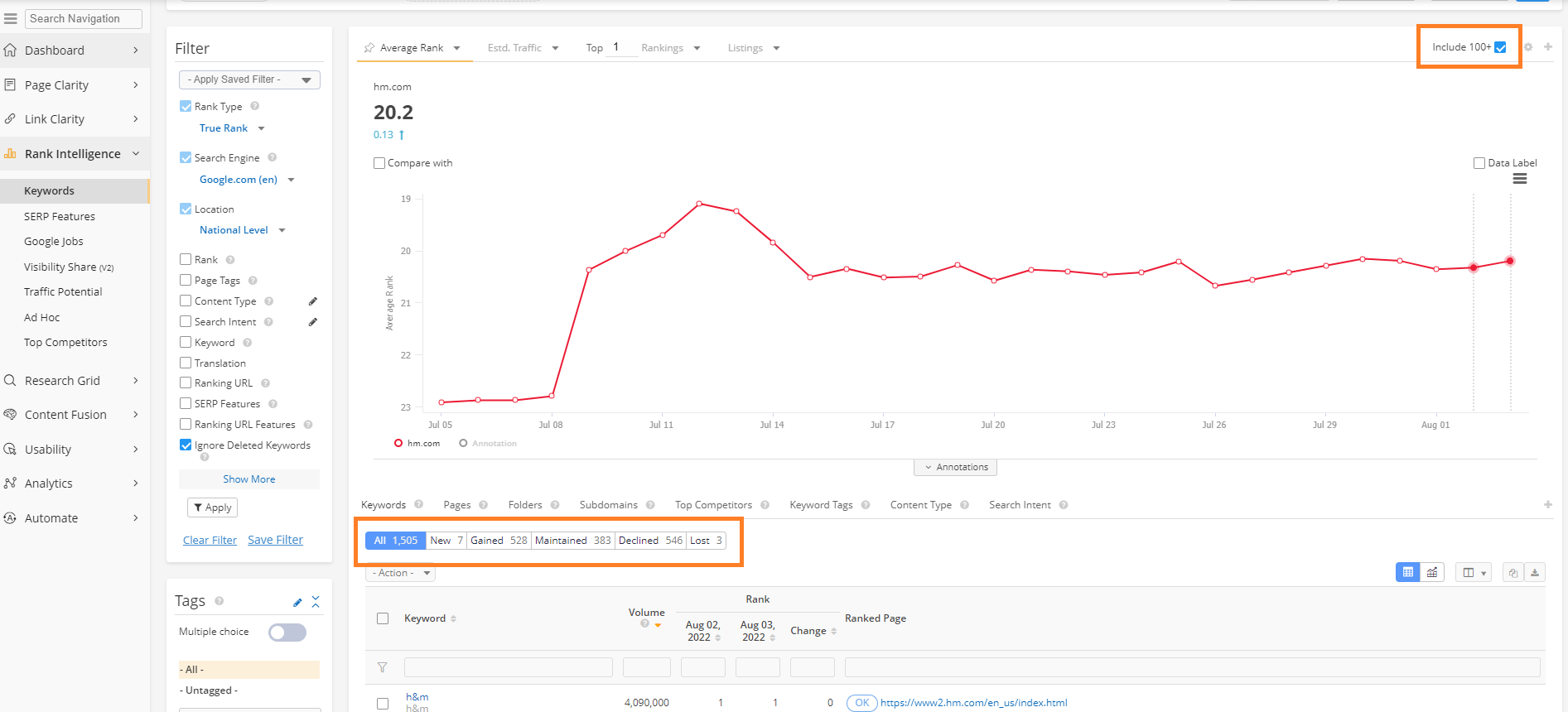Identify changes in keyword rankings, spot trends, and opportunities in keyword performance