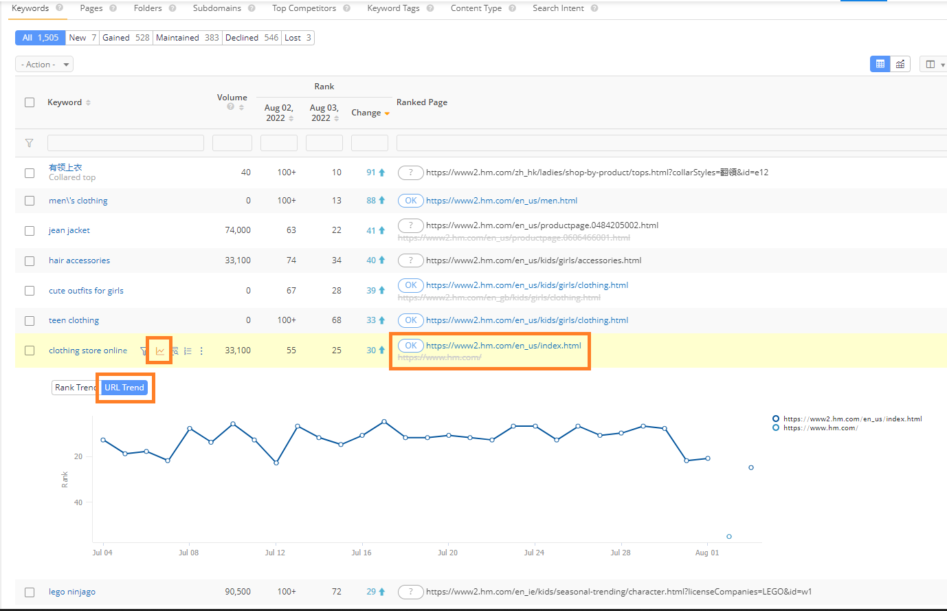 The Ranked Pages column in the Keywords view shows when the ranking page changes. The previous ranking page is shown in light gray with a strikethrough indicating it is no longer ranking highest for the keyword. While the previous page displayed may not be ranking highest, it may still be ranking within the results. You can check the URL Rank Trend view (hover to the right of the keyword) and then click on URL Trend to quickly see the history of fluctuations in pages ranking and whether there are multiple pages ranking for the keyword.