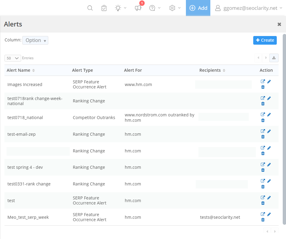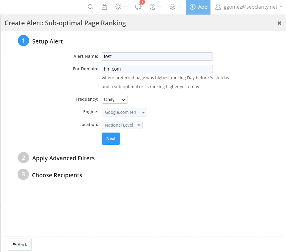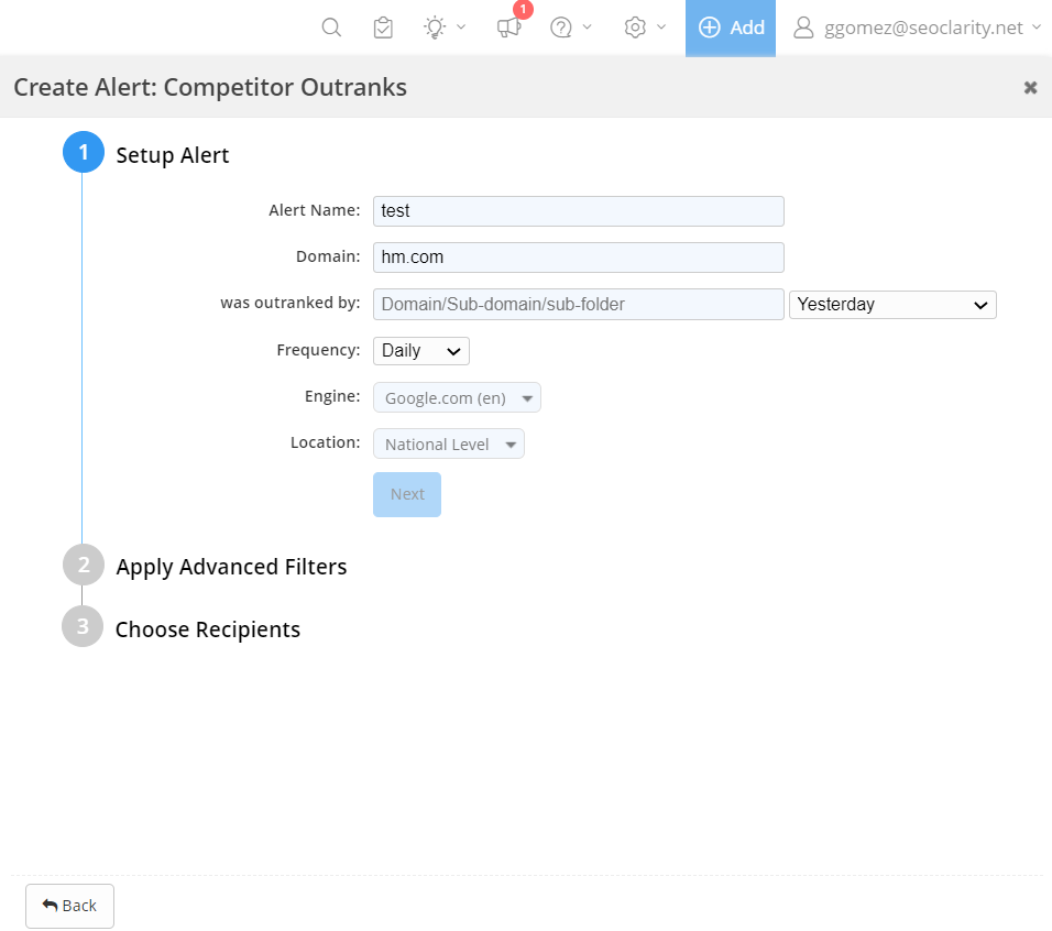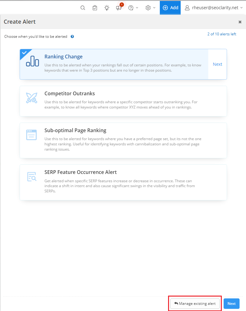 Useful in highly competitive environments where there are a handful of dominant players (coupons, travel, etc.) This alert helps you know when a competitor starts ranking higher than you, when you rank higher than them, when a part of your site from another country ranks higher in the wrong place, or if an old version of your site ranks higher than your new one.