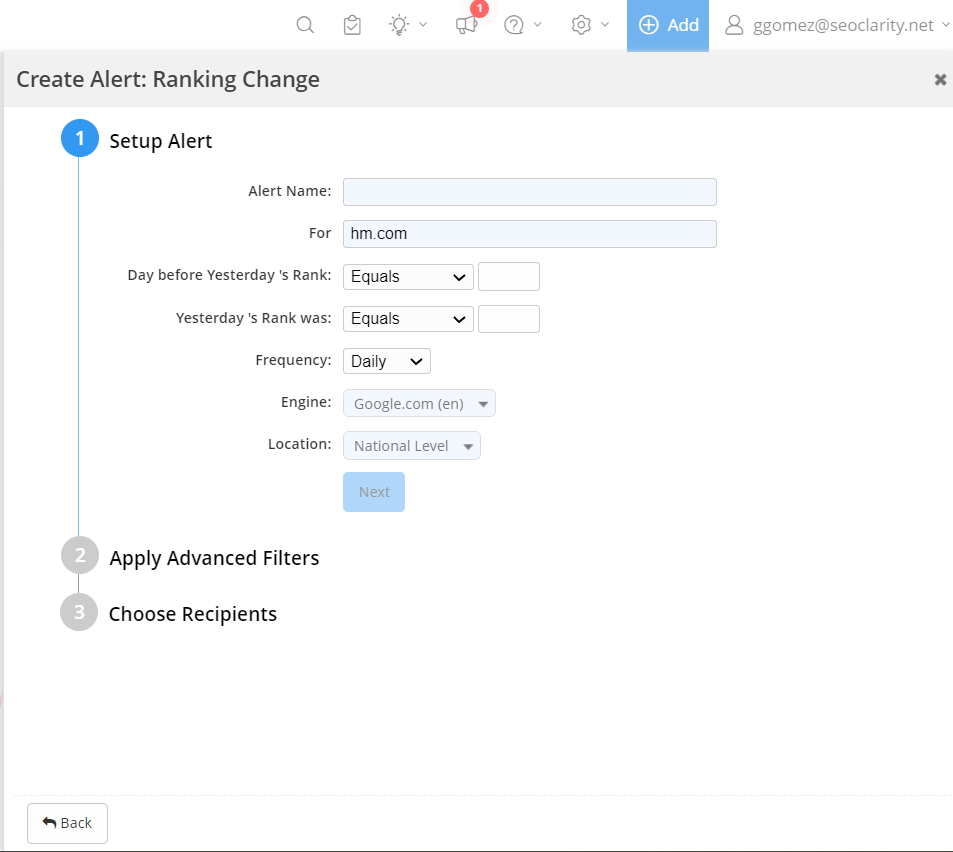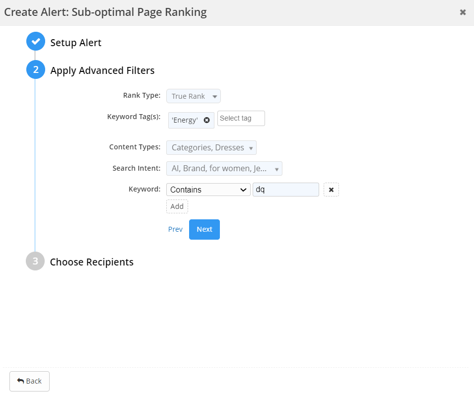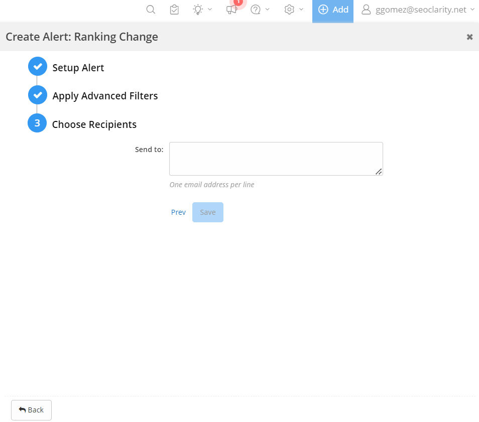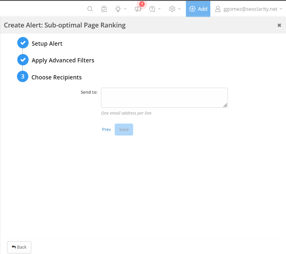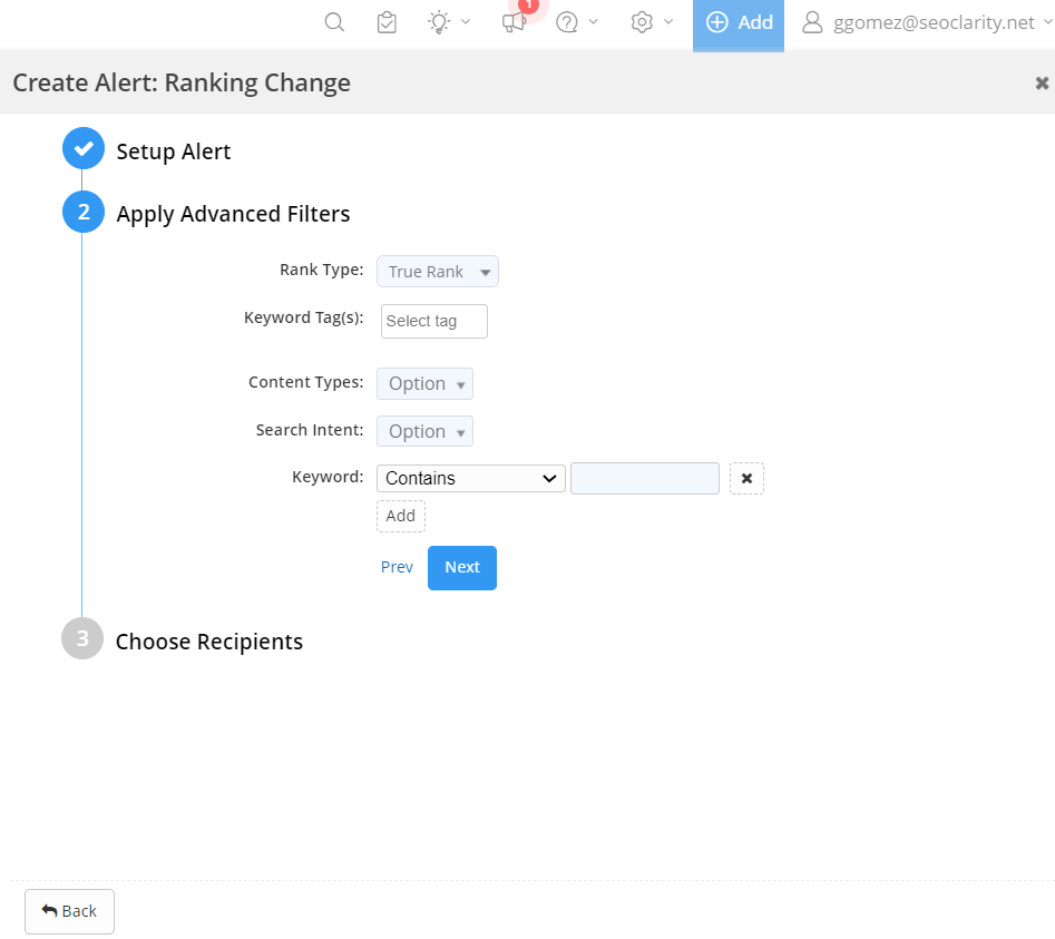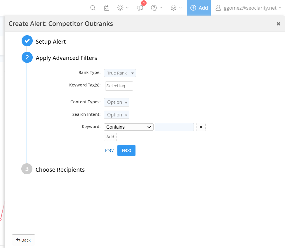 This alert helps you know, for example, when your important keywords drop out of the top three positions, when competitors make big gains, or when targeted keywords improve after you make changes.