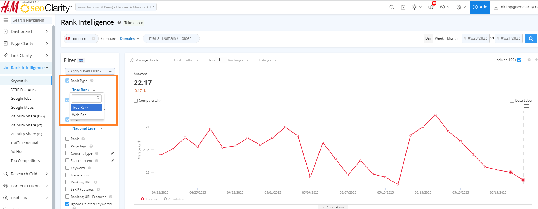 In Rank Intelligence, you have the option to choose True RankĀ or Web Rank when viewing ranking data. Here are the differences between the two: Google True Rank is the keyword's ranking on the search engine results page (SERP) that includes the ...