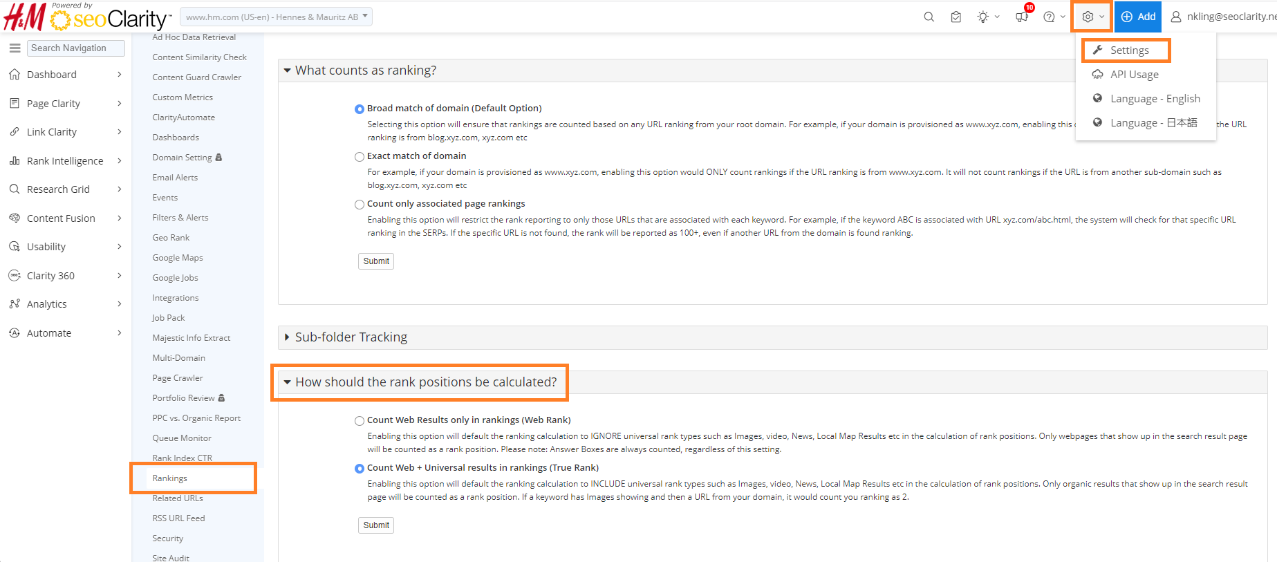 Learn More. On the Settings navigation menu, select the Rankings tab and select the third option 'How should the rank positions be calculated?' to view how rankings are calculated in widgets. Downloading All from the tables will be based on True Rank by default, but Web Rank results will be downloaded if selected.