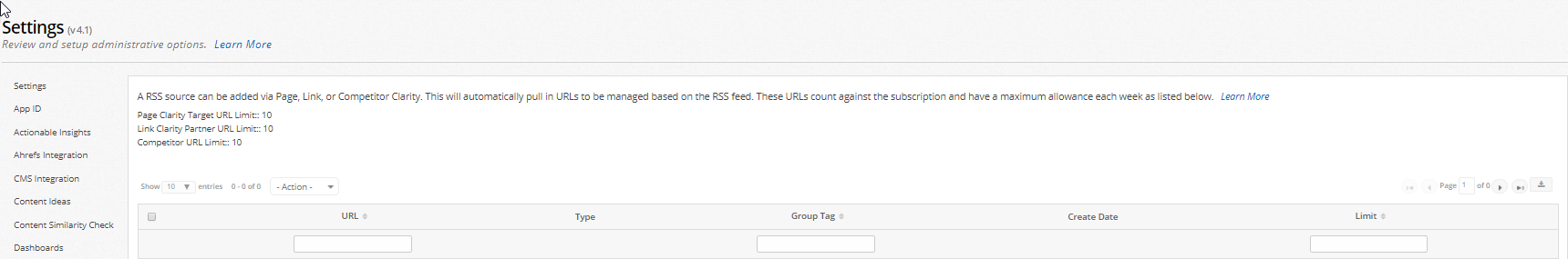 A RSS source can be added via Page Clarity, Link Clarity, or Competitor Clarity. These URLs count against the subscription, the maximum is 100 and have a default allowance each week as listed below: