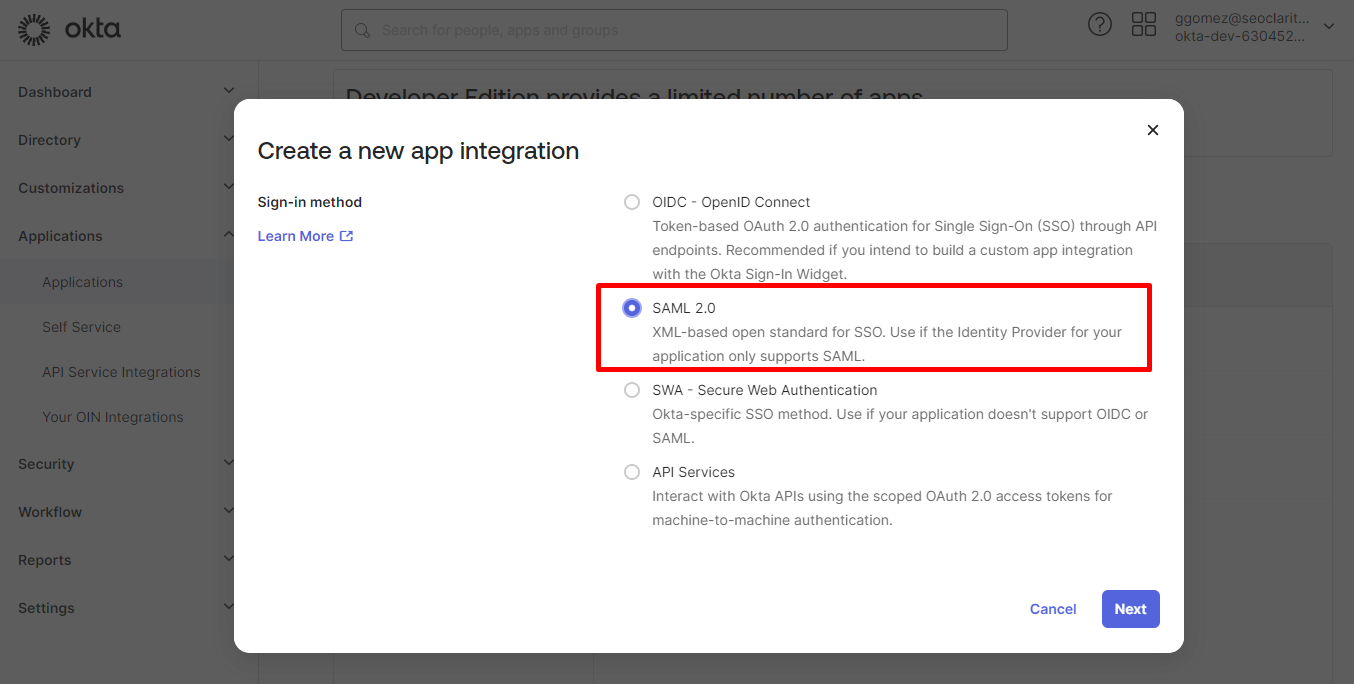 1. Sign in to your Okta organization as a user with administrative privileges. If you don't have an Okta organization, you can create a free Okta Developer Edition organization via https://developer.okta.com/signup/ .