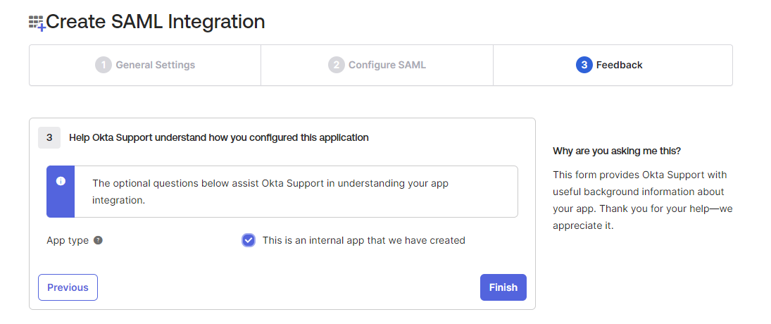 7. In the Feedback section, select the This is an internal application that we created check box and click Finish.