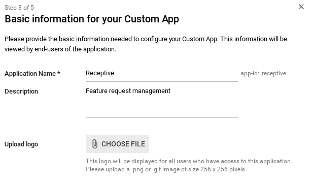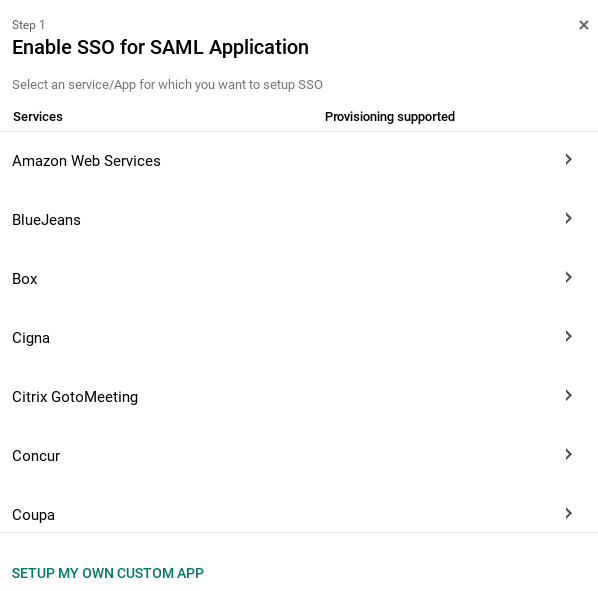 3) Choose "Setup my own custom app" at the bottom of the list. Choose "Option 2", download your IDP metadata. Send it to our DEV teams.