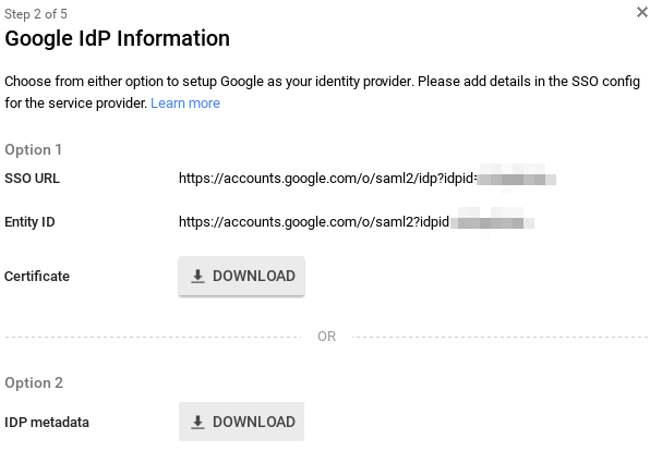 Using Google as an example, we need you to provide the SSO URL, Entity ID and Certificate or IdP metadata file. The IdP metadata file is simpler and highly recommended. More information on Google SAML can be found here.