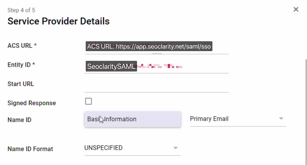1b) If you don’t have IdP metadata.xml , please provide the following to support@seoclarity.net :