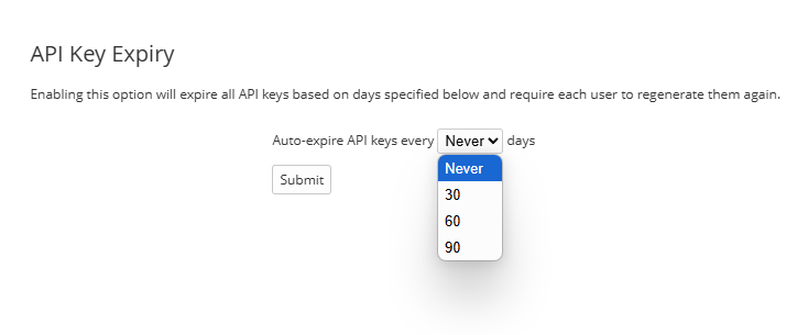 Enabling this option will expire all API keys based on days specified in the drop down menu and require each user to regenerate a new key again.