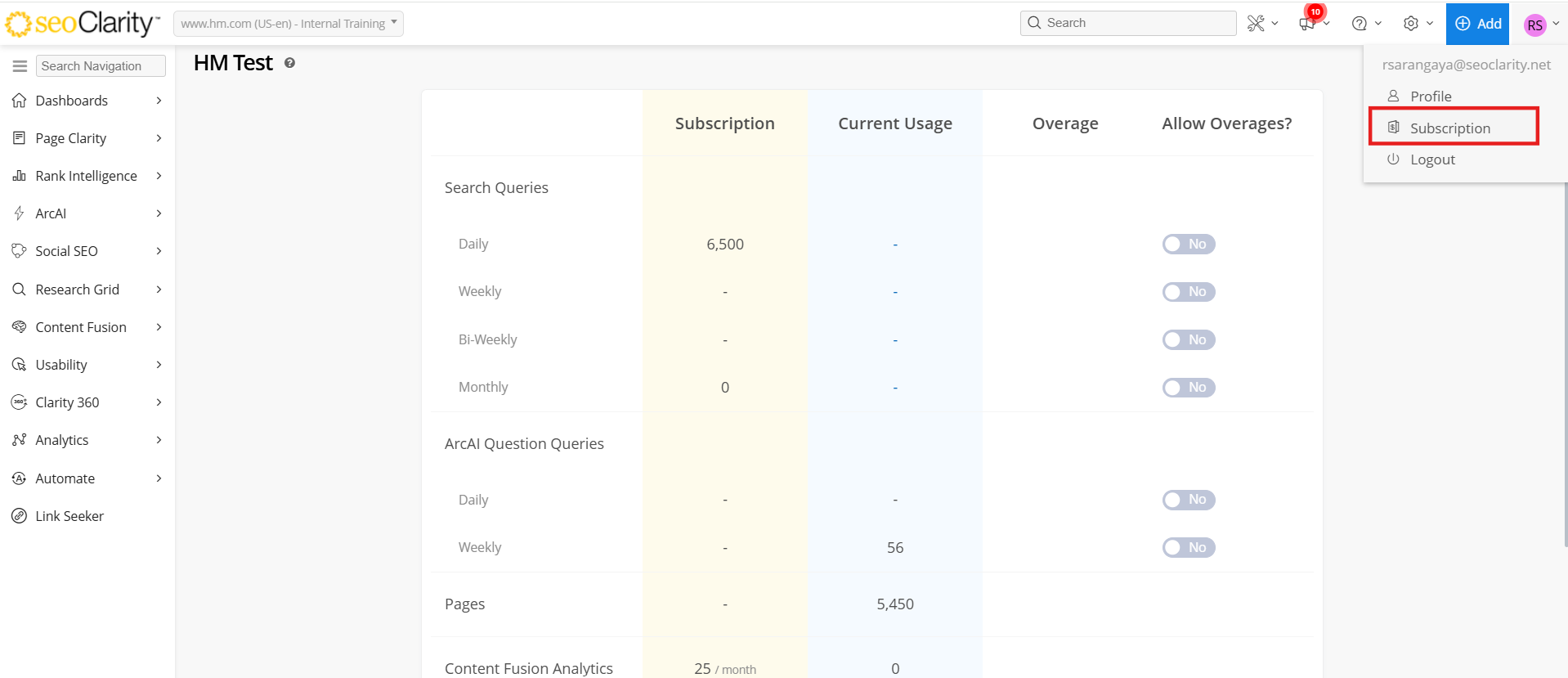 support@seoclarity.net. One enabled the subscription view is accessible to all platform users via the top navigation subscription link in the profile dropdown (pictured below) and a summary of queries is present on the Managed Domains page.