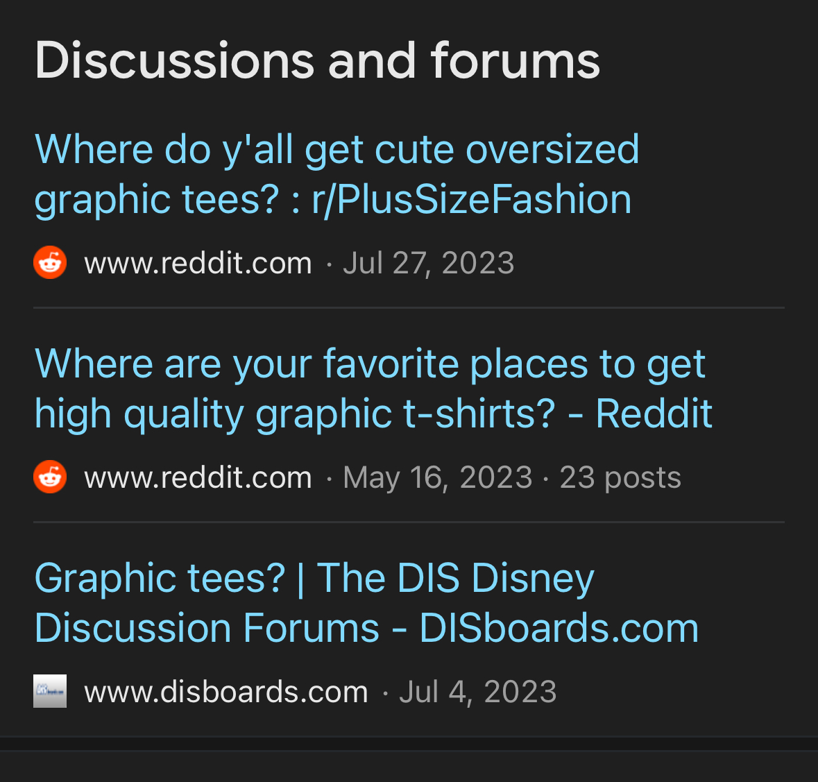 Discussions and forums: You may want to explore ways to get more mentions in these forums. You also might want to consider building user forums on your site and incentivizing your customers to post there. While known forums like Reddit dominate this feature, it is possible for forums form other sites to show.