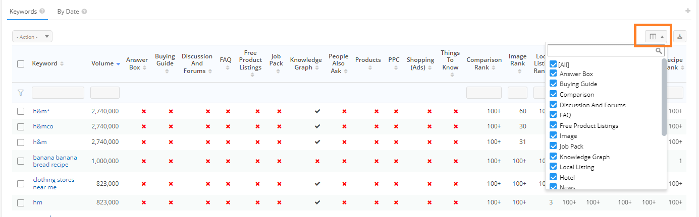 This displays managed keywords and if they were found with that SERP feature. Where available, SERP Features will display the rank position they were found at. Click on the "Table" icon to select which metrics display in the table.