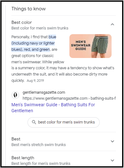 Things To Know: This is a categorized Featured Snippets list for the various micro-intents people have when searching for items of interest. Great source of content ideas, either for adding missing information to your existing content or for creating new pages to cover each intent displayed.