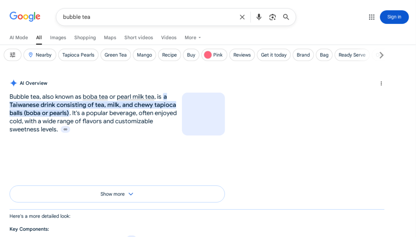 AI Overview: Displays AI-generated summary that answers the user's search query. It pulls key information from multiple sources to provide a concise explanation right at the top of the results. Users can also expand the section for more details or explore linked sources for further reading.