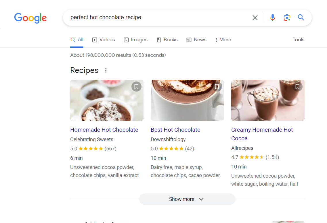 Recipe: Displays recipes in a grid with images, user ratings, time to make, and an extract of the ingredients, making it easier for searchers to find the recipes that appeal to them.