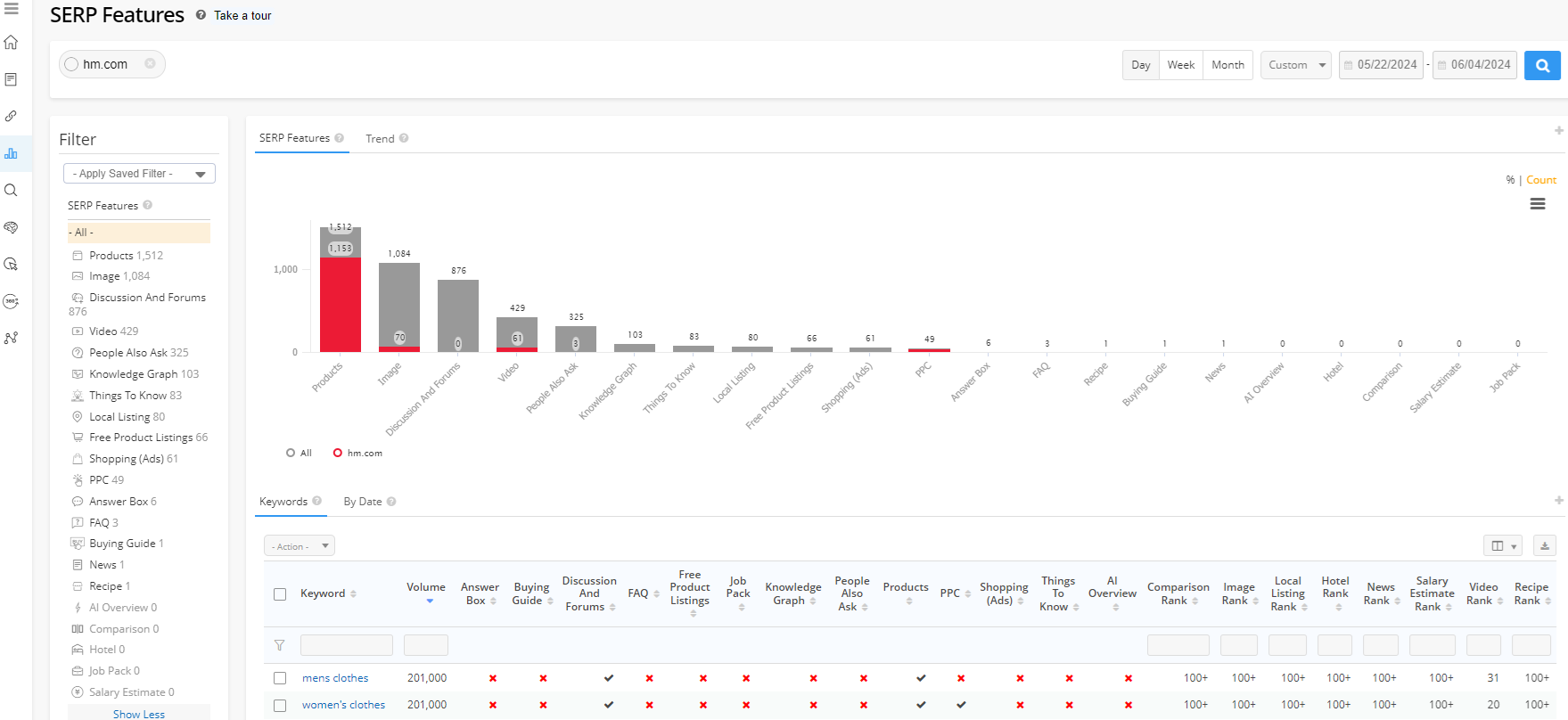 SERP Features: This displays the number of unique managed keywords found with that SERP features and the number of unique keywords the searched domain is present in that feature.
