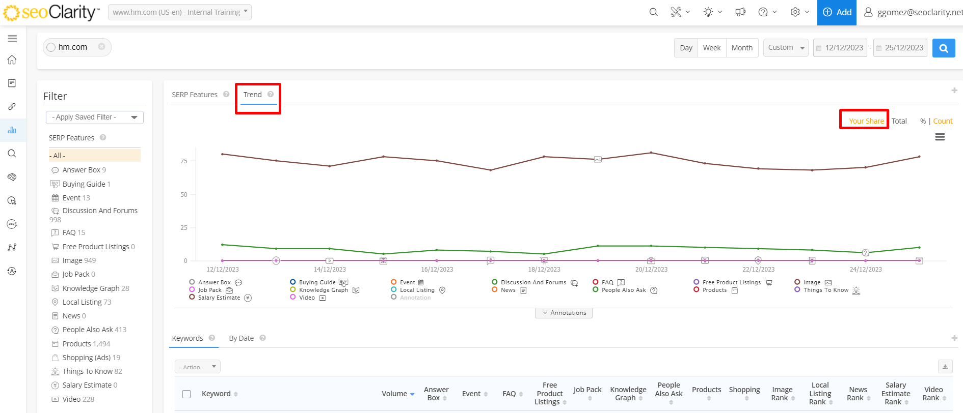Trend: This displays a trend count of unique managed keywords and the SERP features found for them.