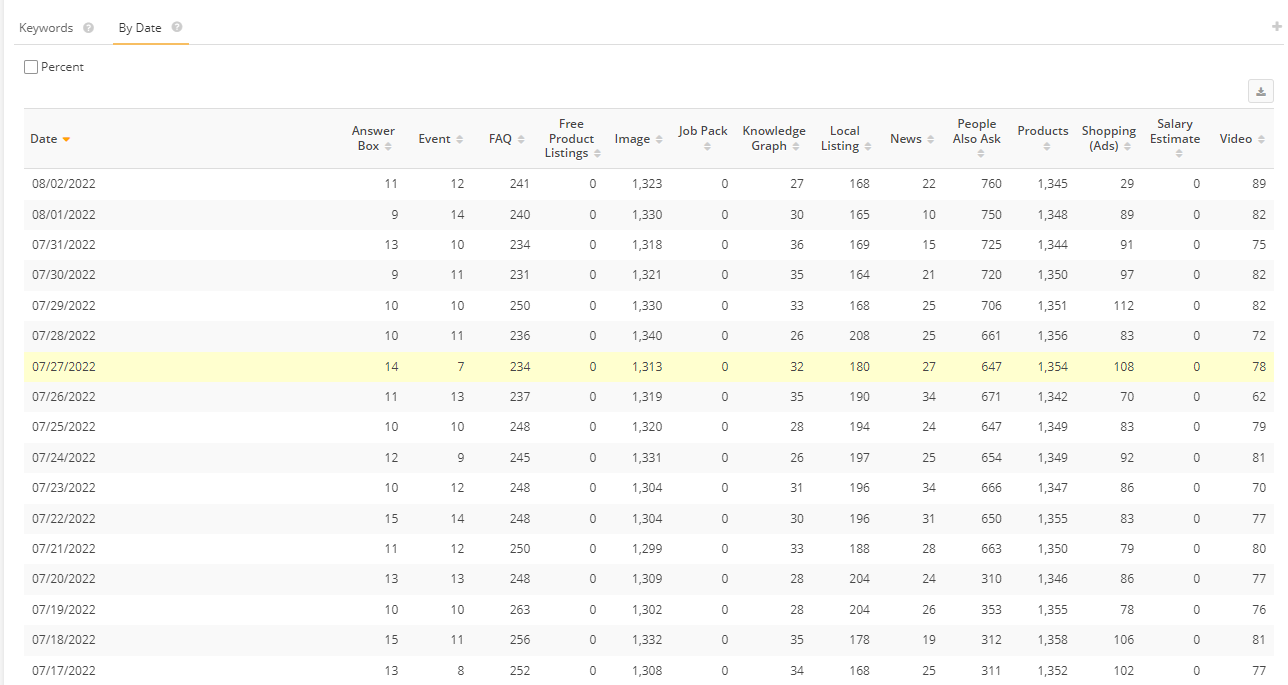 When viewing the data table 'by date', selecting the percent option displays the percent value of the managed keywords that triggered the SERP Feature divided by total managed keywords.
