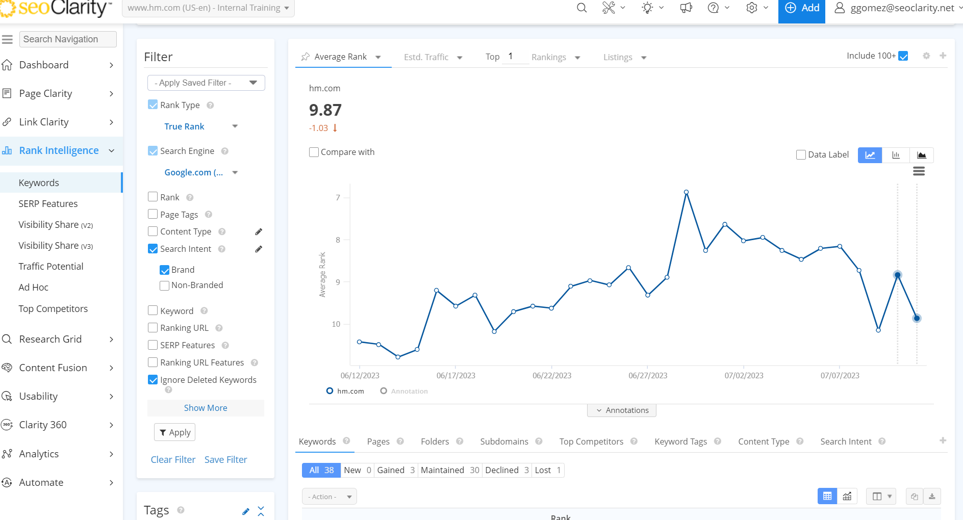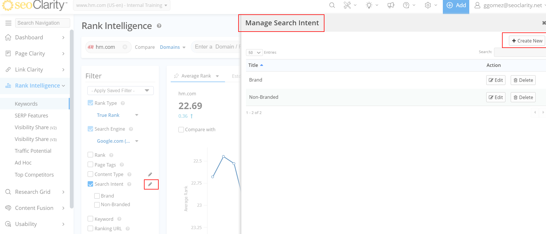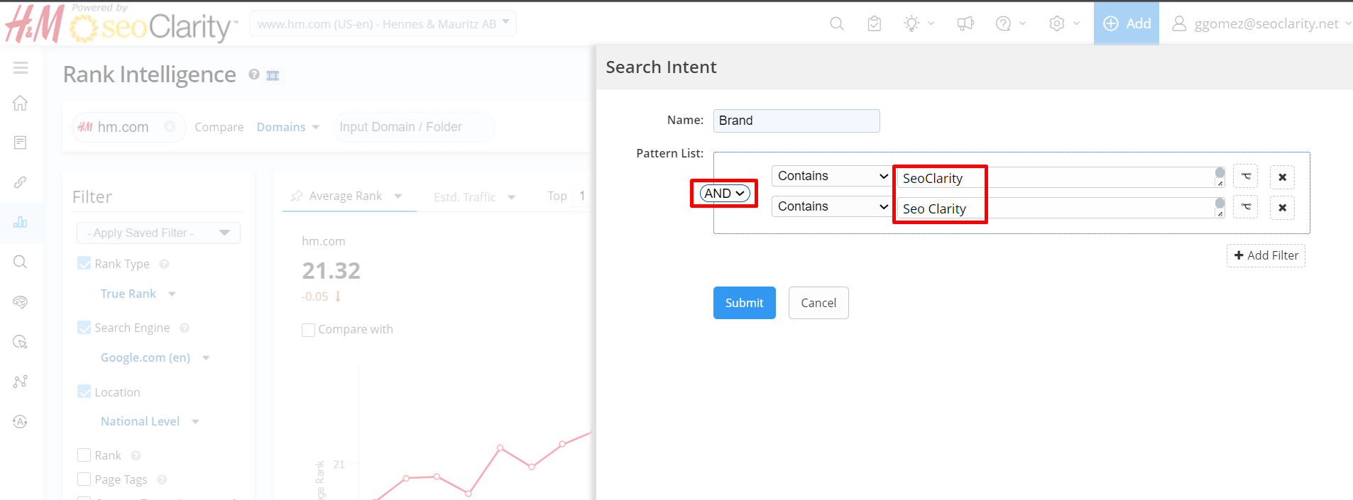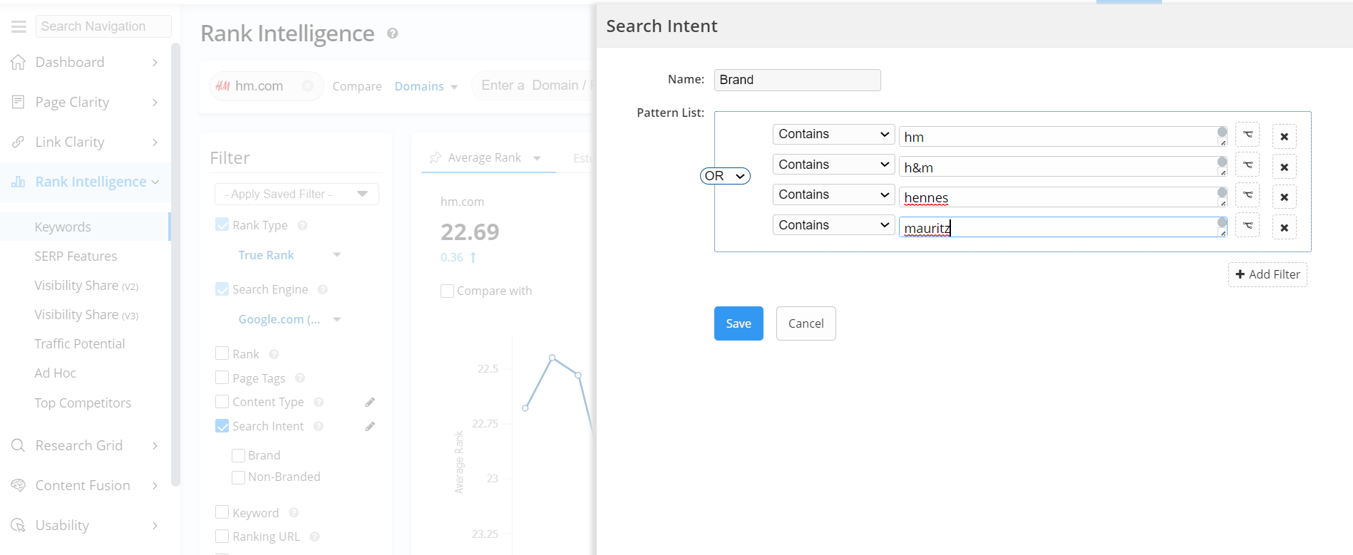 Search Intent filters can be configured and are available in multiple platform features (Rank Intelligence is seen in the example below). The most commonly setup Search Intent patterns are Brand and Non-Brand. Search intent can be used for any keyword matching filters though.