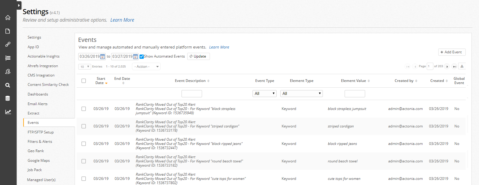The Events page summarizes events tracked within the platform. Events are recorded automatically, for functions like keyword additions, or can be entered manually.