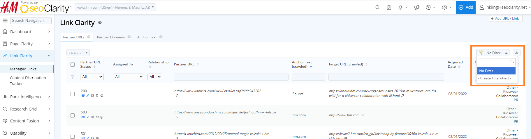 When you click on the ‘Type’ column buttons such as ‘Target URL’ it will take you directly to the applicable Page Clarity page and engage the filter for you.