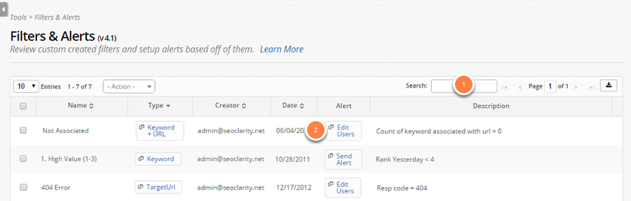 Filters & Alerts are a great way to stay on top of everything happening with your site and we mean it. Set these up properly in order to not have anything fall through the cracks. There are different types of filters for different parts of the platform keywords, pages, and keyword + URL pairs and you can set them up in those specific features. Follow along with the Setting Up Alerts to learn how to set them up in the different parts of the platform.