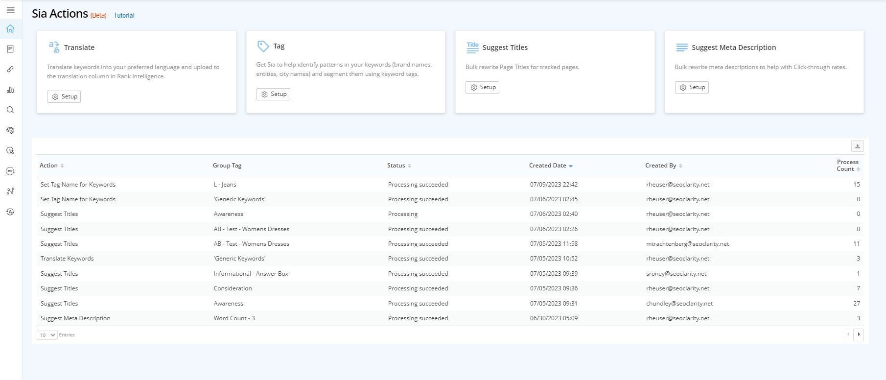 Sia is seoClarity's AI model built based on our framework for Enterprise AI. Sia Actions allows for use of AI across a variety of tasks including: translation, tagging, page title creation, and meta description creation.